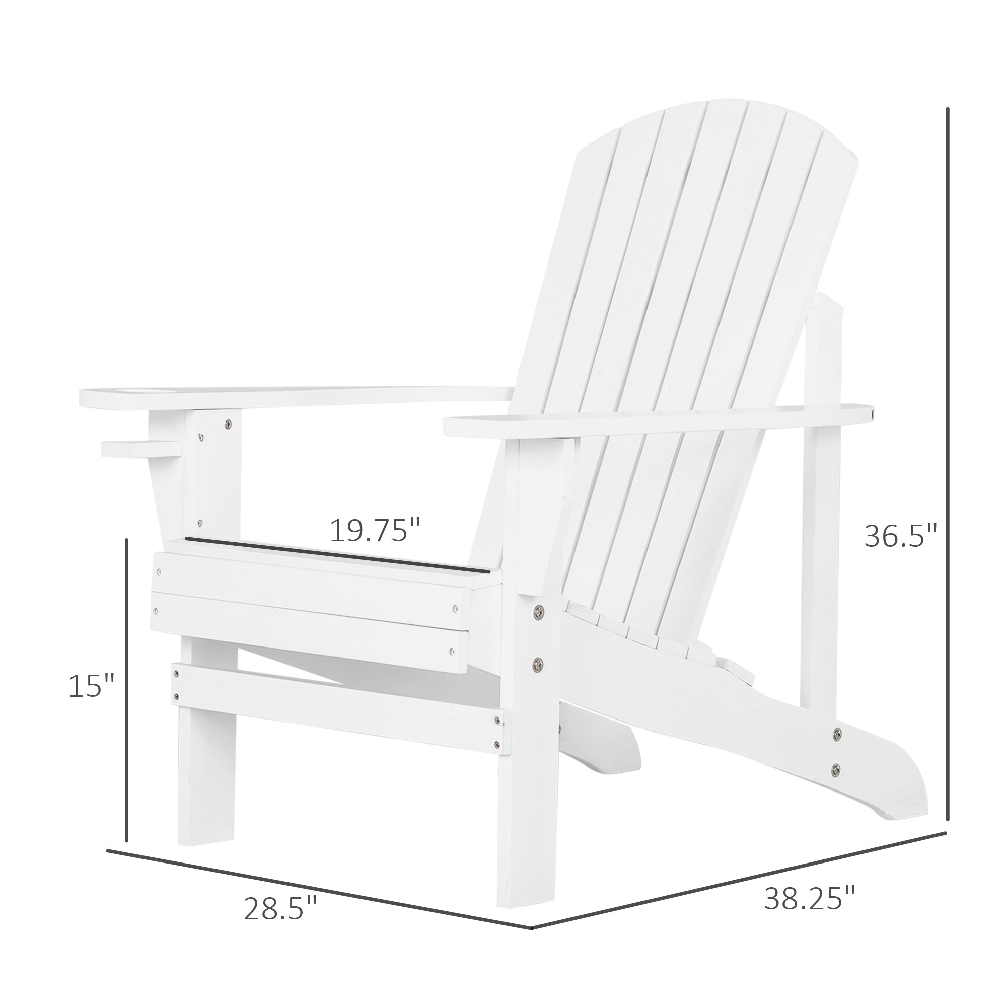 - Adirondack Chair Dimensions: 72.5 cm (28.5 in) W x 97 cm (38.2 in) D x 93 cm (36.6 in) H; Seat Dimensions: 50 cm (19.7 in) W x 50 cm (19.7 in) D x 38 cm (15 in) H. Weight Capacity: 150 kg (330 lb).