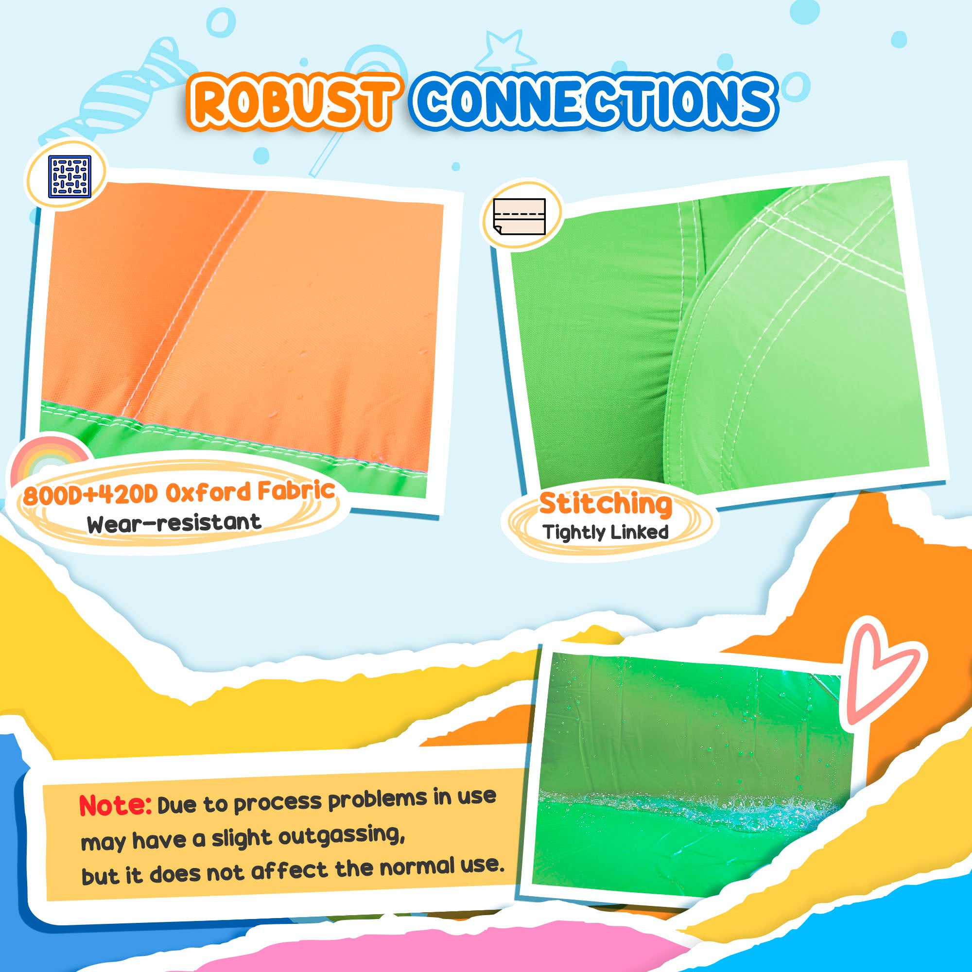 - Safety: Safety is our top priority. Ground stakes protect this bouncy castle and its inflator from the wind. The high-density Oxford fabric is weather-resistant and large enough to accommodate 4 children at a time. We also include two patches of each color for easy repairs.