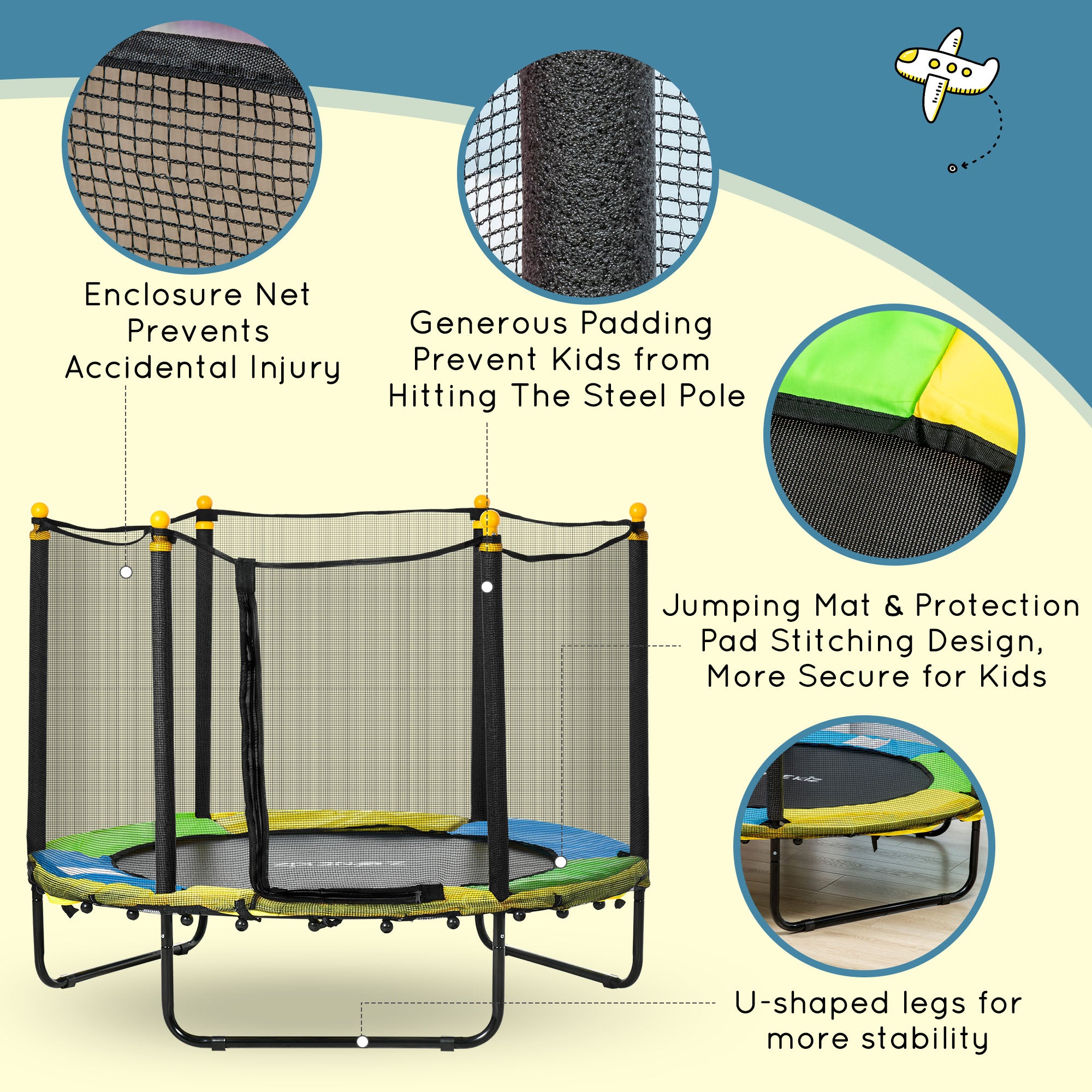 - Safety: Bungees offer a safer option than springs, reducing the risk of pain or injuries. Thick-padded poles and safety pads to prevent accidents. Net surrounding the recreational trampoline so kids won't fall off as they jump.