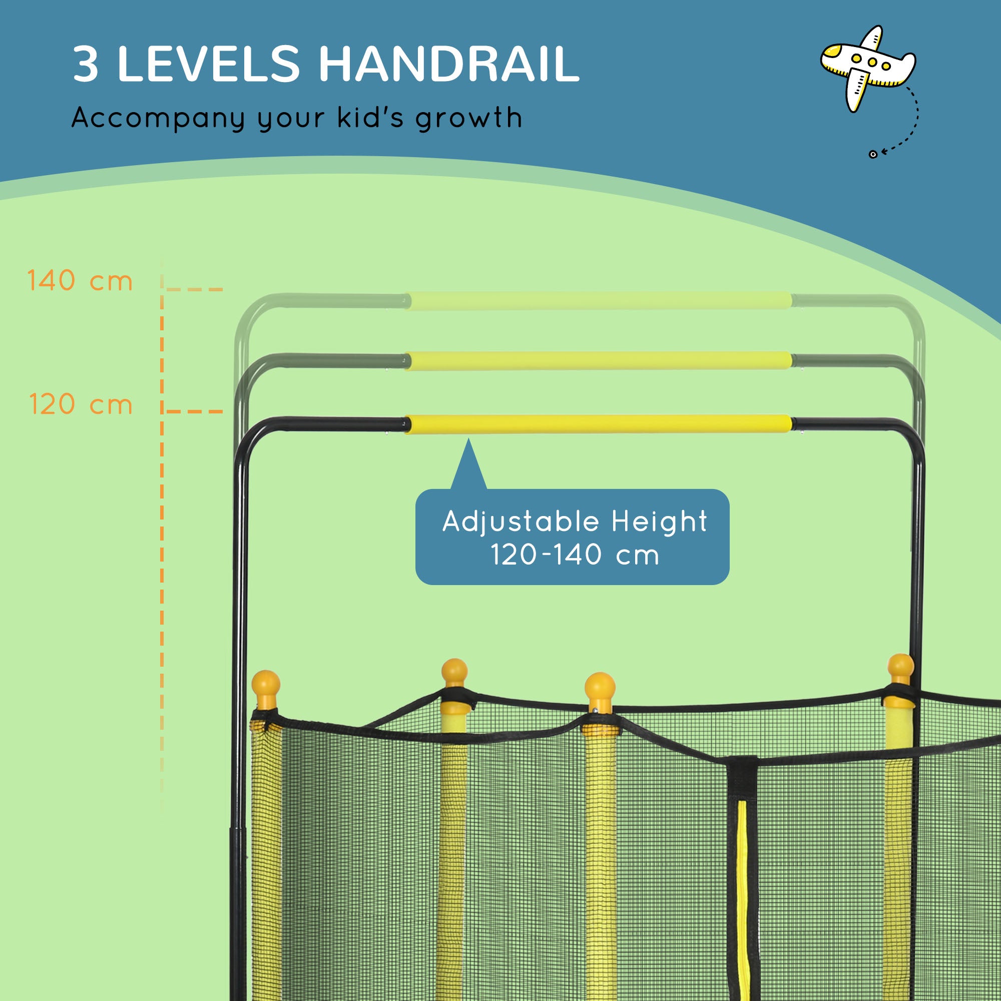 - Safety: Bungees offer a safer option than springs, reducing the risk of pain or injuries. Thick-padded poles and safety pads to prevent accidents. Net surrounding the trampoline, so kids won't fall off as they jump.