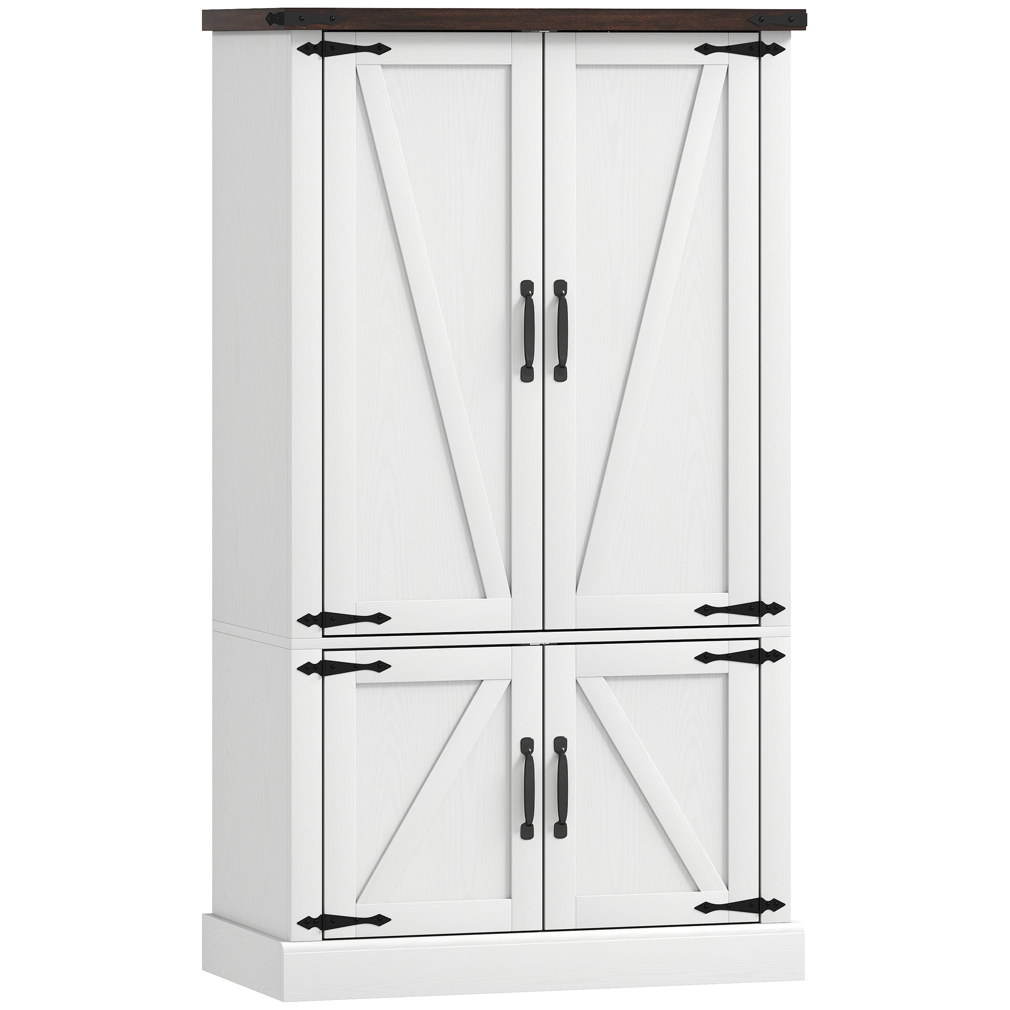 This kitchen storage cabinet brings an elegant country charm to your space with its barn-style doors and vintage handles. Its bright white finish blends easily into a modern or traditional kitchen, creating a warm and organized atmosphere.