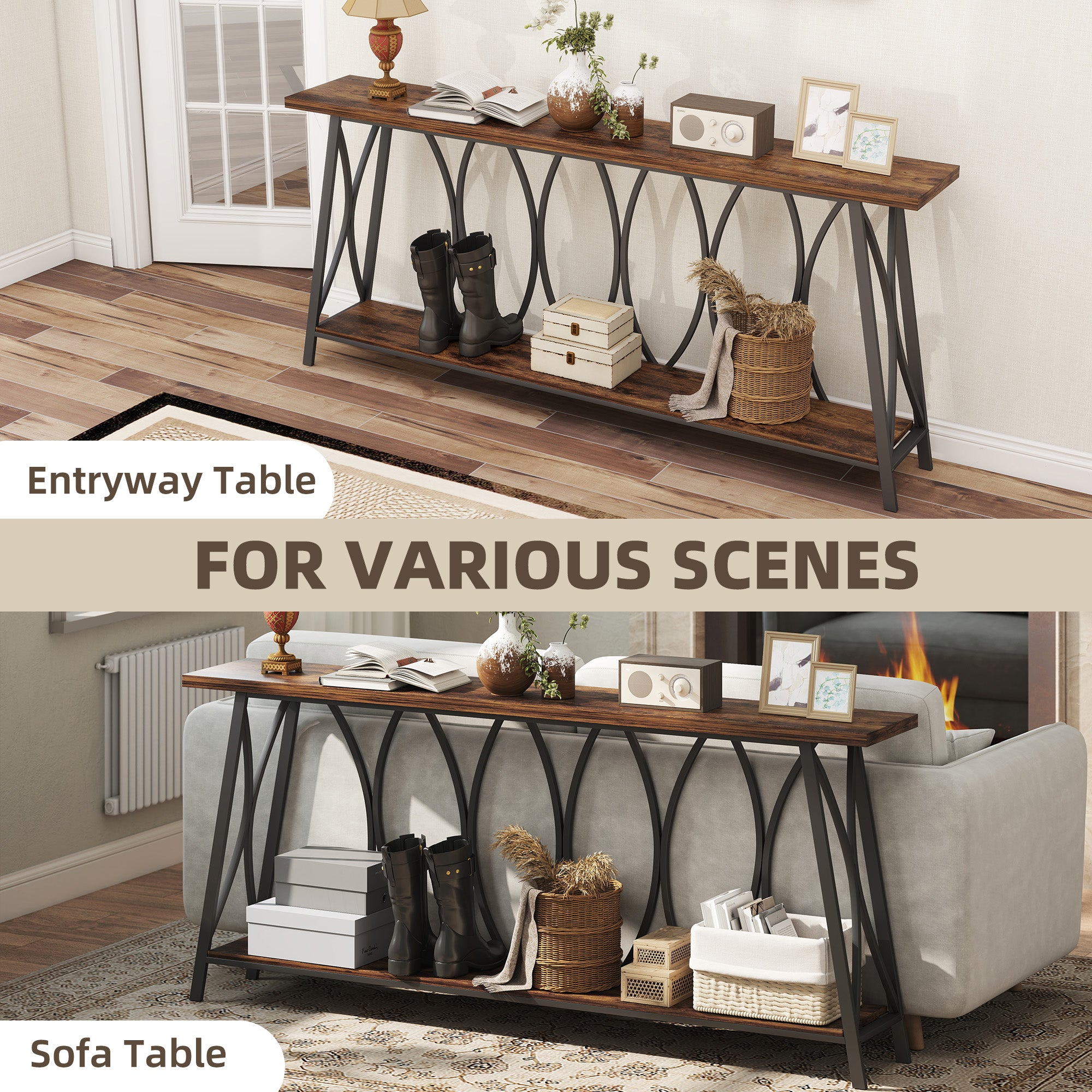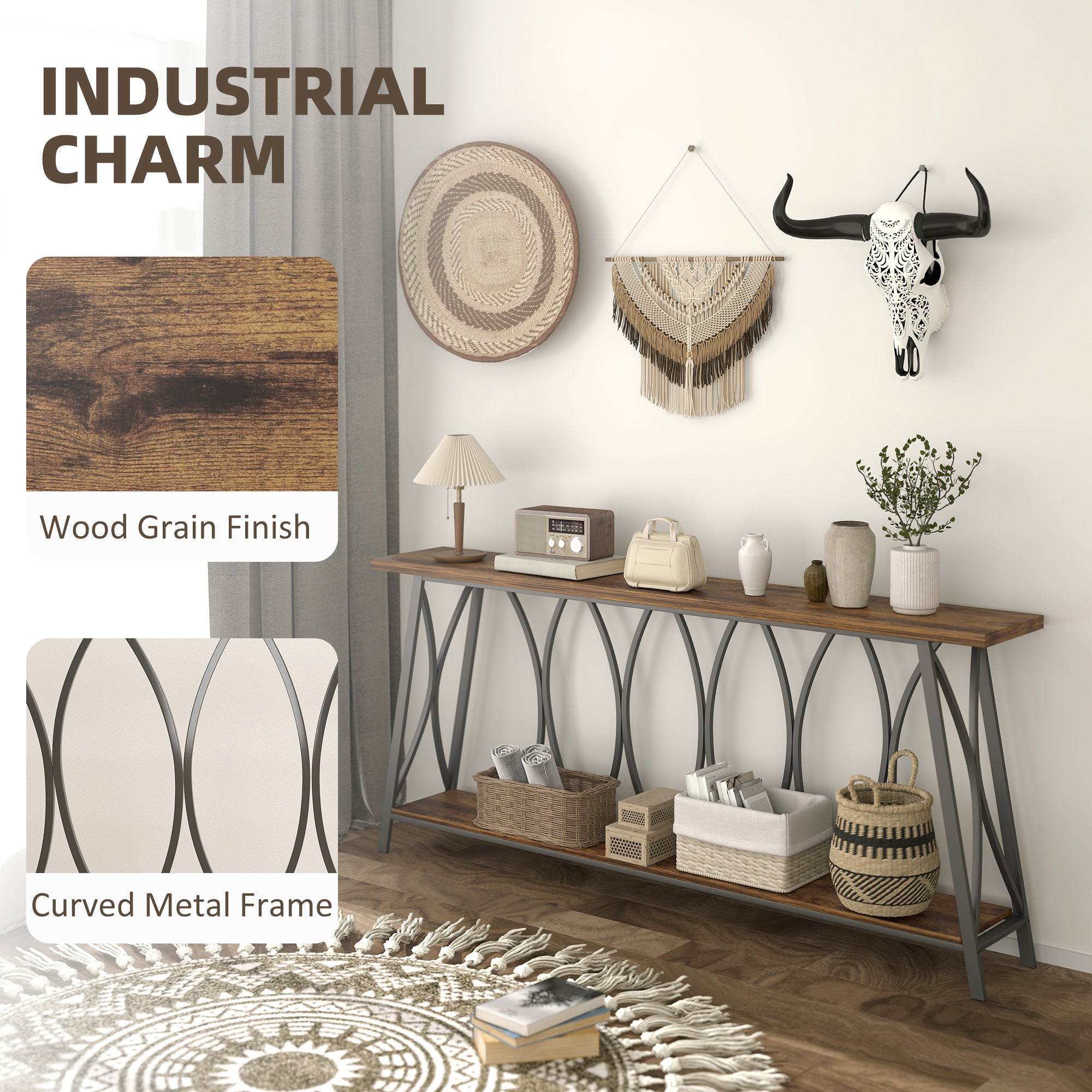 Comfort and design: This console table combines industrial charm and modern elegance thanks to its rustic wood finish and curved metal frame. Its distinctive look adds a striking decorative touch, ideal for enhancing a living room, entryway, or hallway.