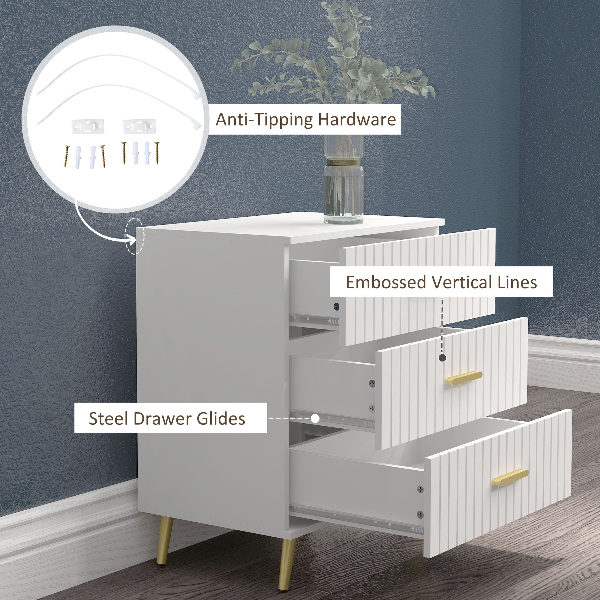 Versatile use: With its three spacious drawers, it allows you to organize clothes, pajamas, blankets, linens, or accessories. The steel drawer slides ensure smooth opening, while the top provides a convenient space for a lamp, decorations, or other everyday essentials.
