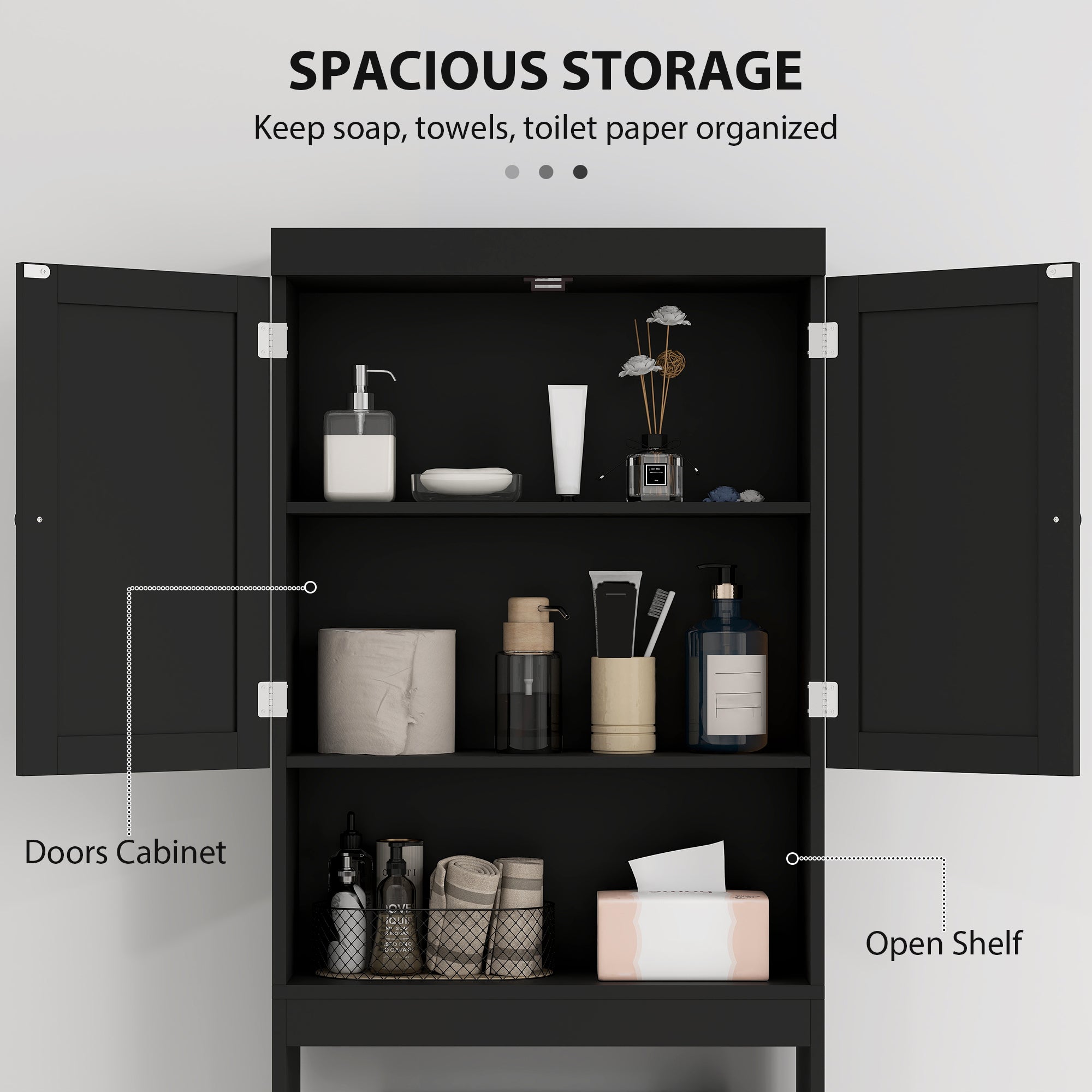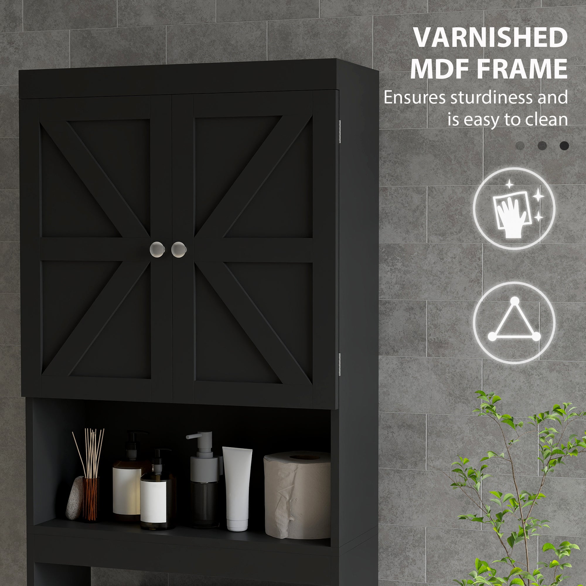 Bring organization and style to your bathroom with this freestanding storage unit designed to fit over the toilet. Its compact design maximizes vertical space while providing practical storage with a two-tier cabinet and open shelf. With its easy-to-clean varnished finish and modern-style doors, it combines functionality and elegance. Its adjustable rear rail adjusts to prevent drains, and the included anti-tip kit ensures safe use.