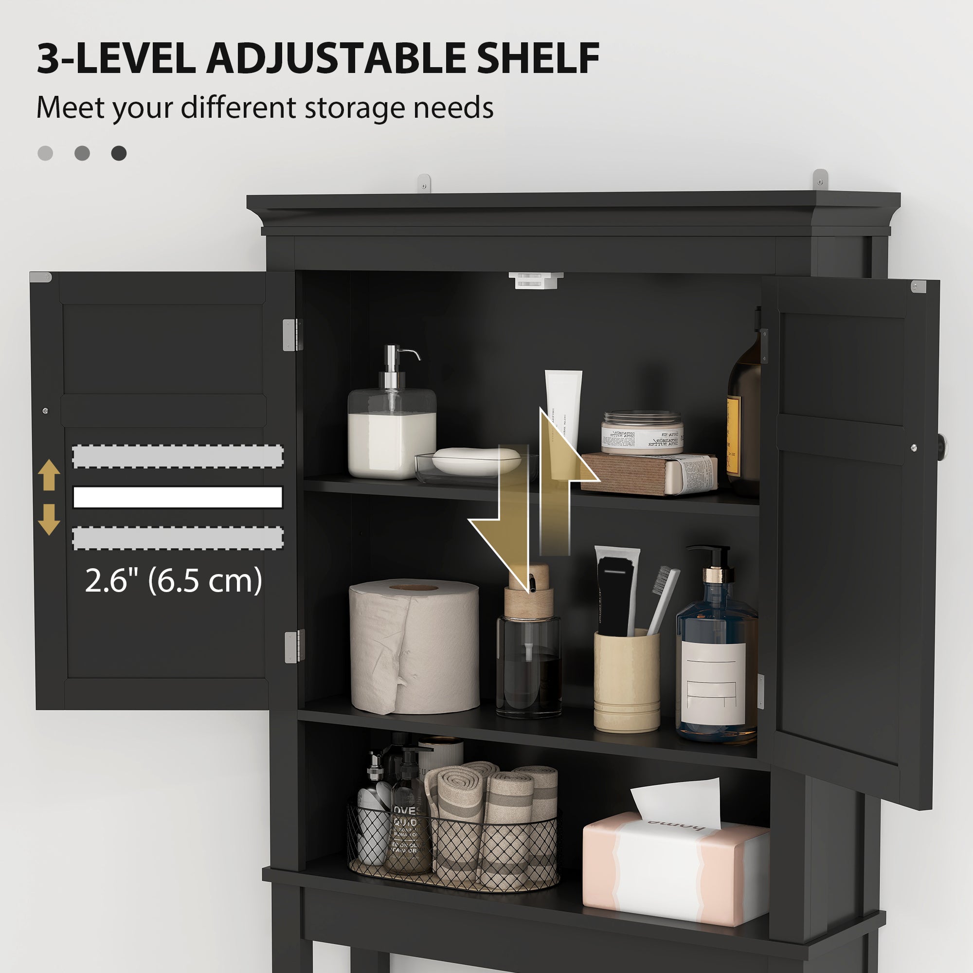 Maximize your space: This free-standing storage unit is designed to fit over a standard toilet, transforming unused space into a practical and attractive storage area. Also ideal for the laundry room or balcony.