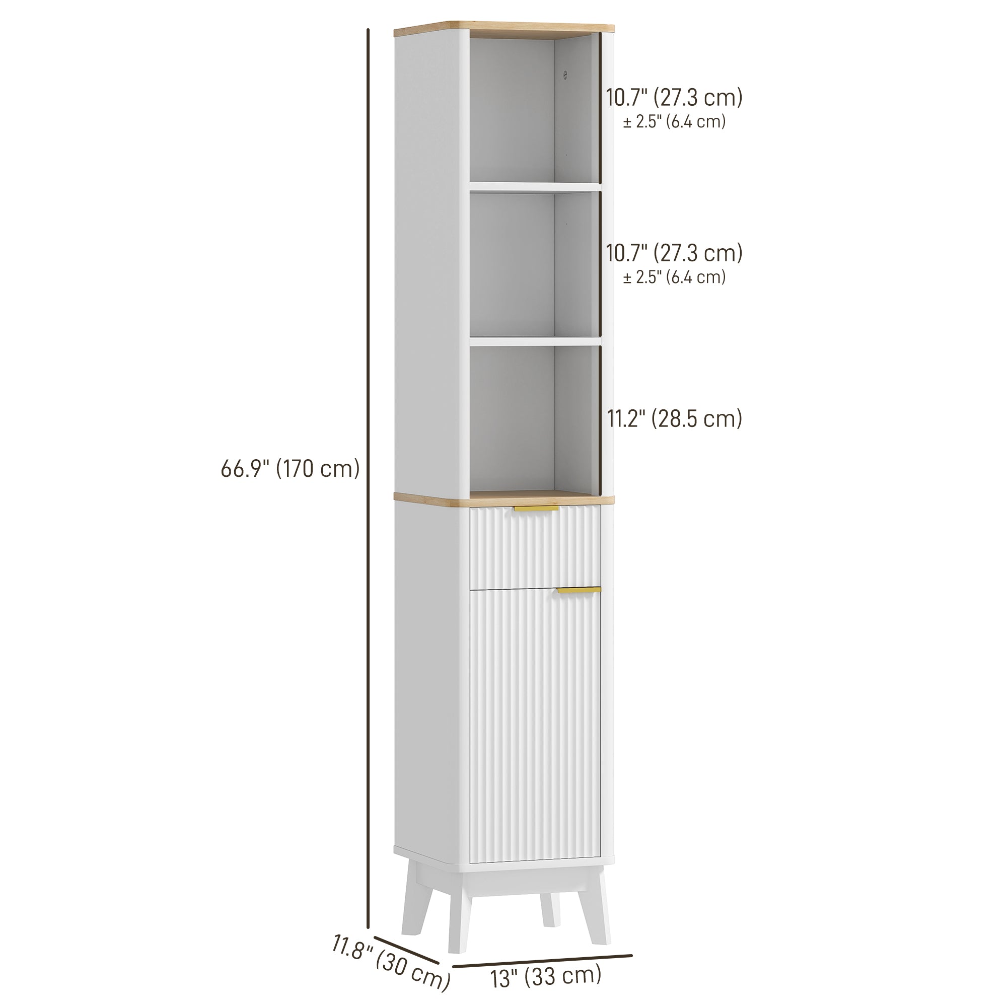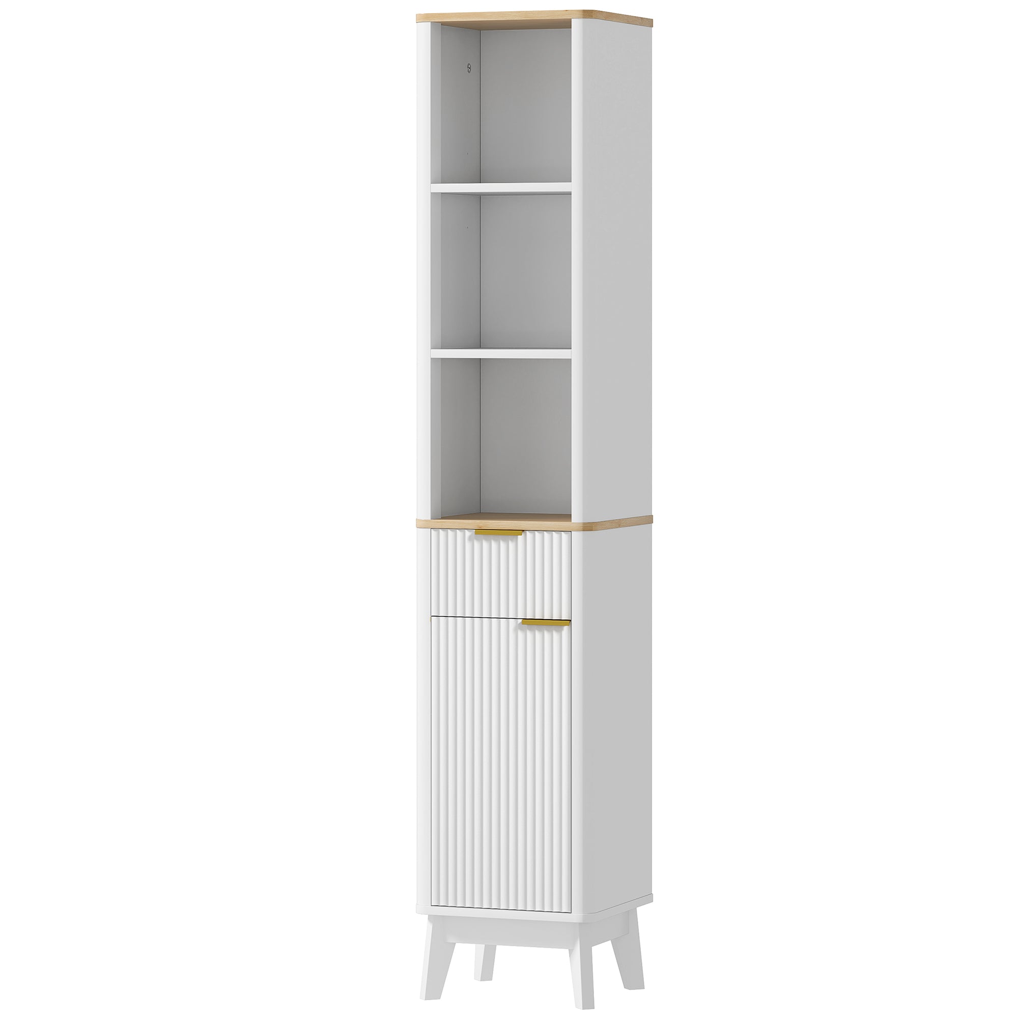 - Modern Elegance: Enhance your bathroom decor with this narrow storage cabinet, featuring a chic two-tone color scheme, charming fluted panels, and elegant gold handles.