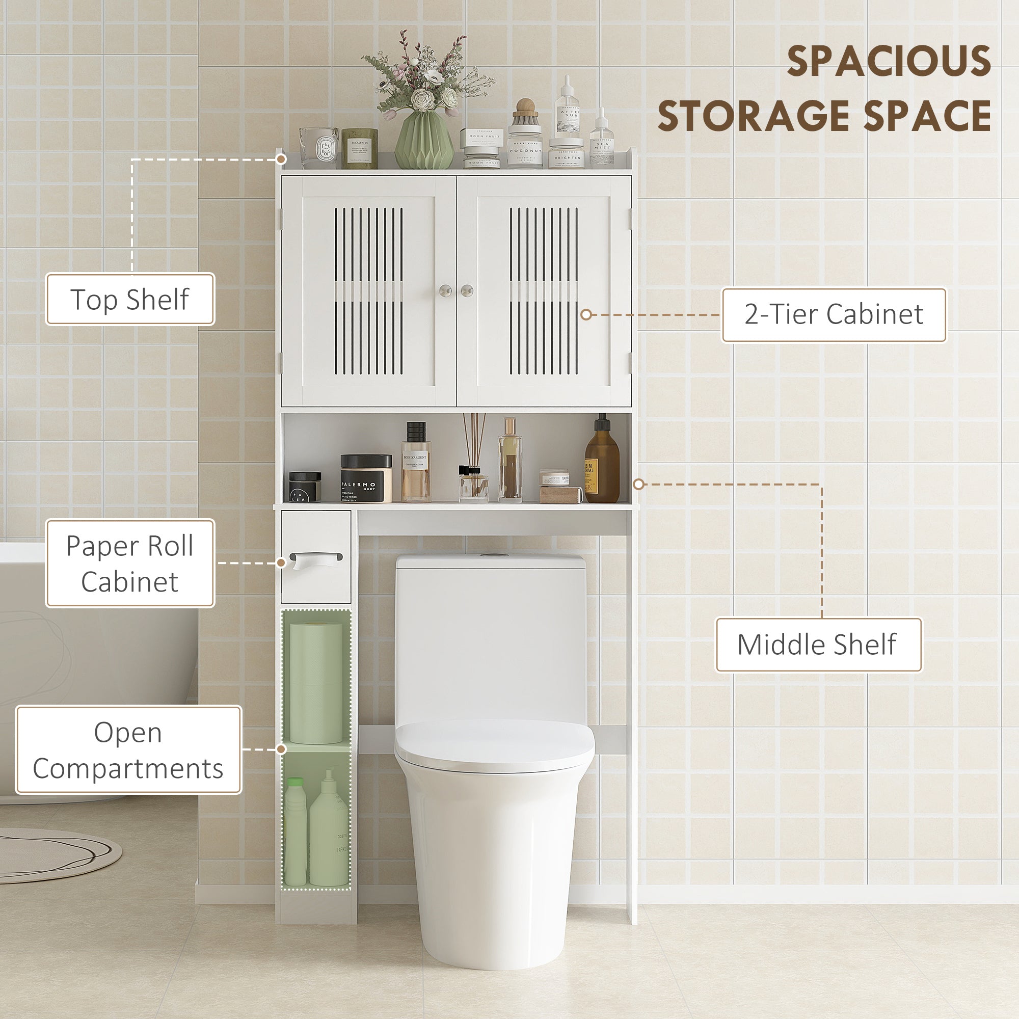 Ample Storage Space : This over-the-toilet storage unit maximizes your bathroom space with its two-tiered cabinets, open shelves, and tissue holder. It helps keep towels, toiletries, and cleaning supplies neatly tucked away while maintaining a compact footprint.