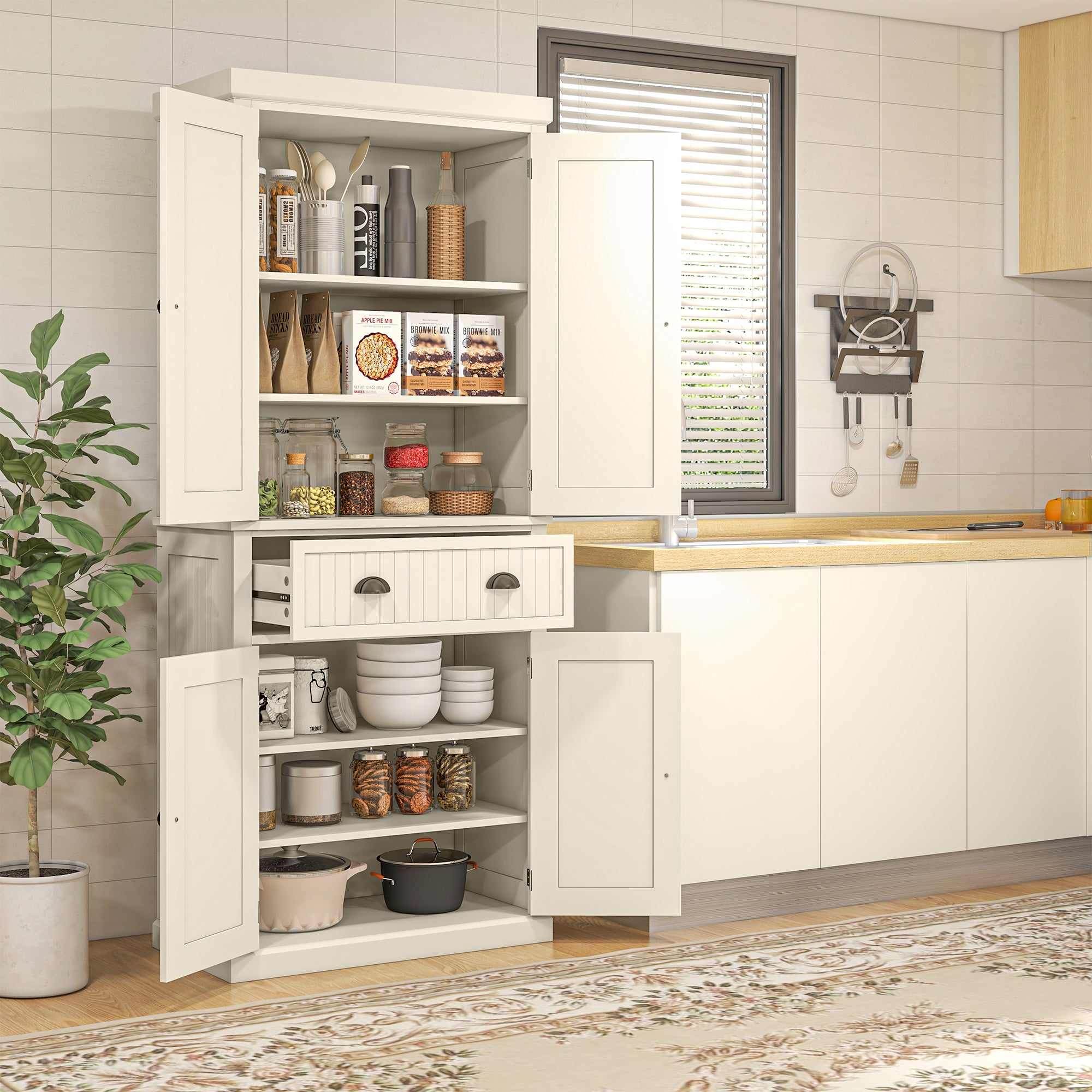 Versatile Use: Thanks to its six-tier design and large center drawer, this pantry offers ample storage space. The three adjustable shelves allow you to customize the layout according to the size of your items—from plates to small appliances. The magnetic doors ensure smooth opening and secure closing, ensuring easy access at all times.