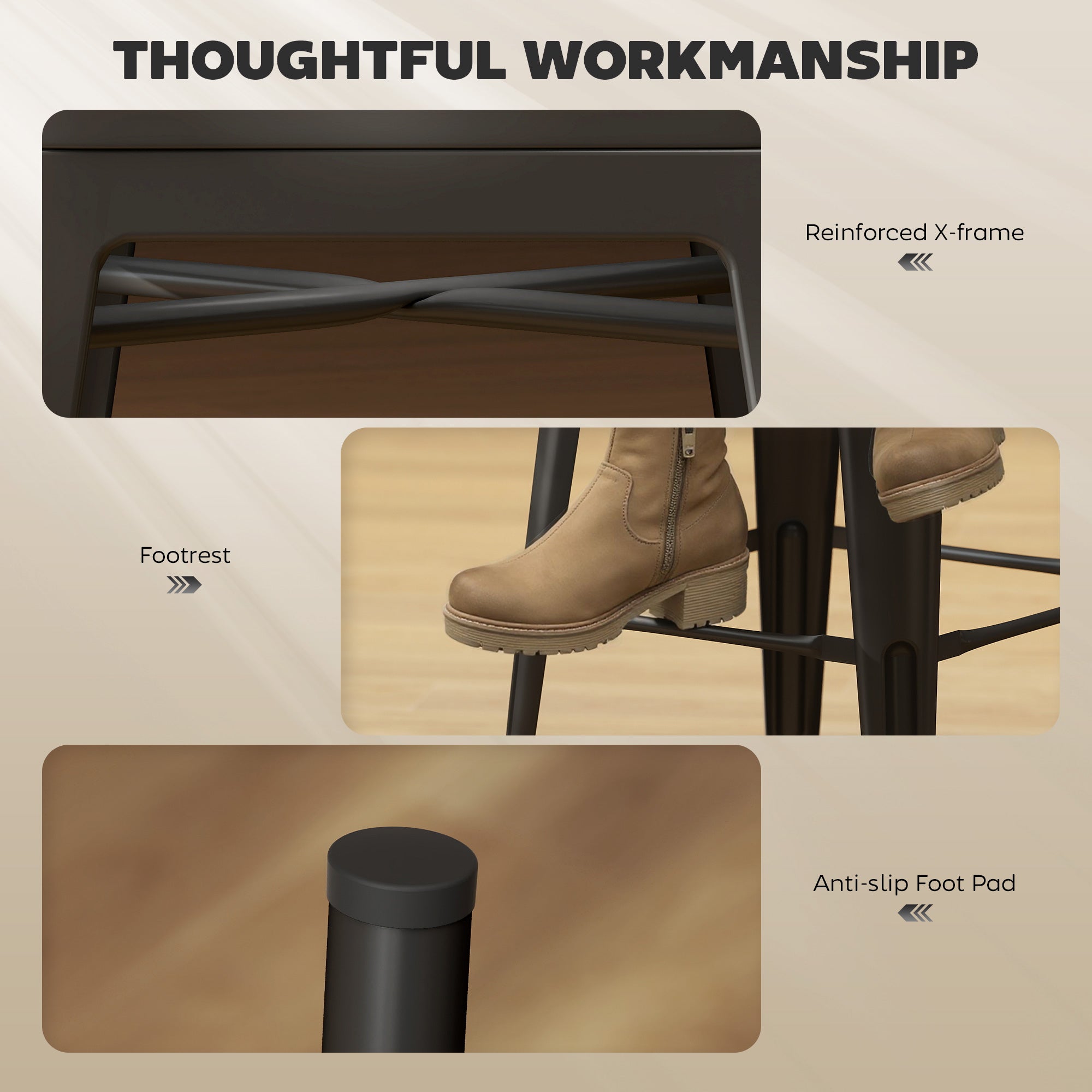 High-quality materials: Made of sturdy metal with a protective powder coating, these stools are durable and weather-resistant. The adjustable feet, equipped with non-slip pads, provide stability and protect your floors.