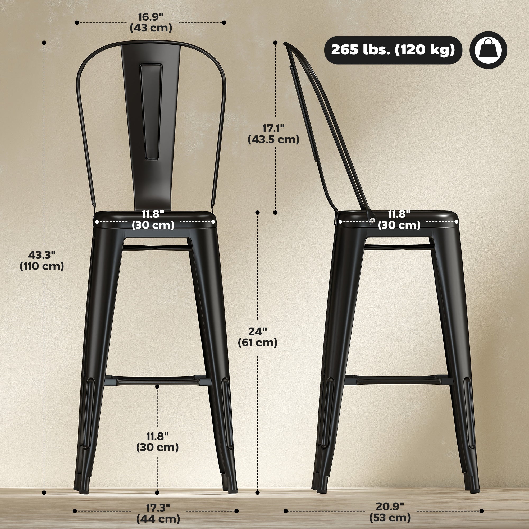 Industrial metal bar stools with removable backrest – Set of 4 (Black)