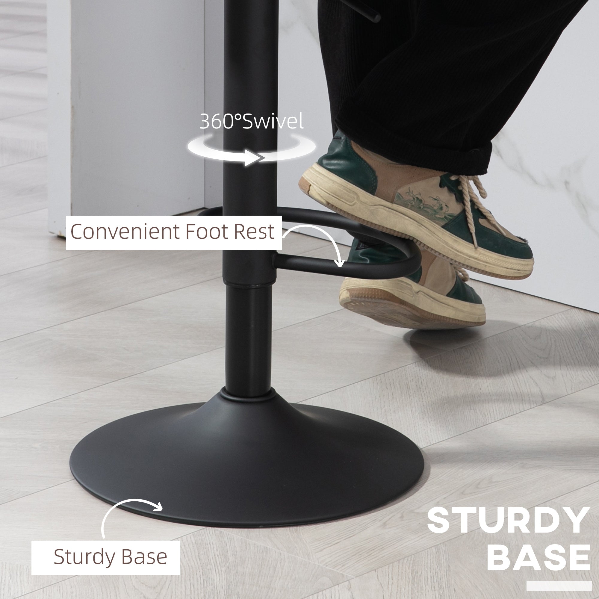 Versatile use: Thanks to their adjustable height and 360° rotation, these stools easily adapt to your space. Their integrated footrest and ergonomic seat offer a comfortable experience, whether you're using them for coffee, dinner, or entertaining guests.