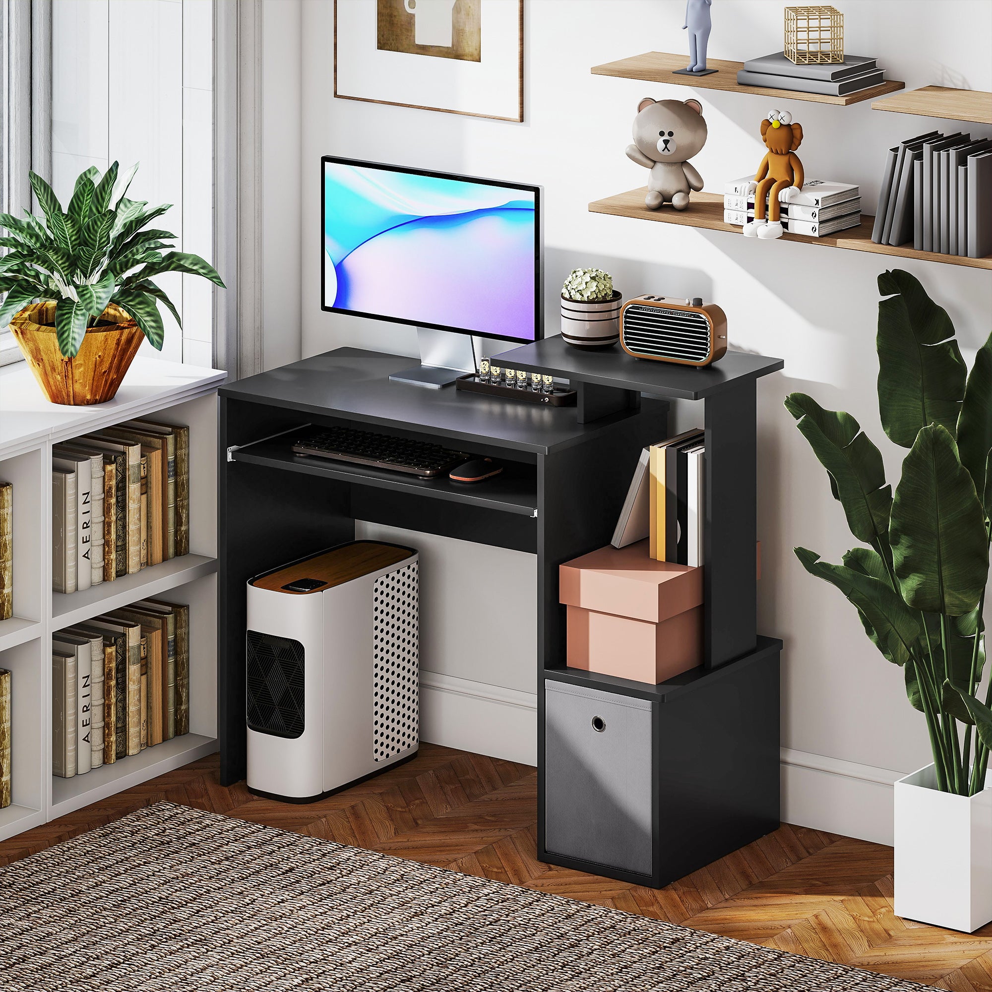 Comfort and design: This computer desk combines modern style and practicality in a compact format ideal for small spaces. Its original design, enhanced with a sliding keyboard tray, a side shelf, and a discreet drawer, brings a contemporary touch to your workspace. Its elegant black color blends easily with any decor, from a professional office to a student room.