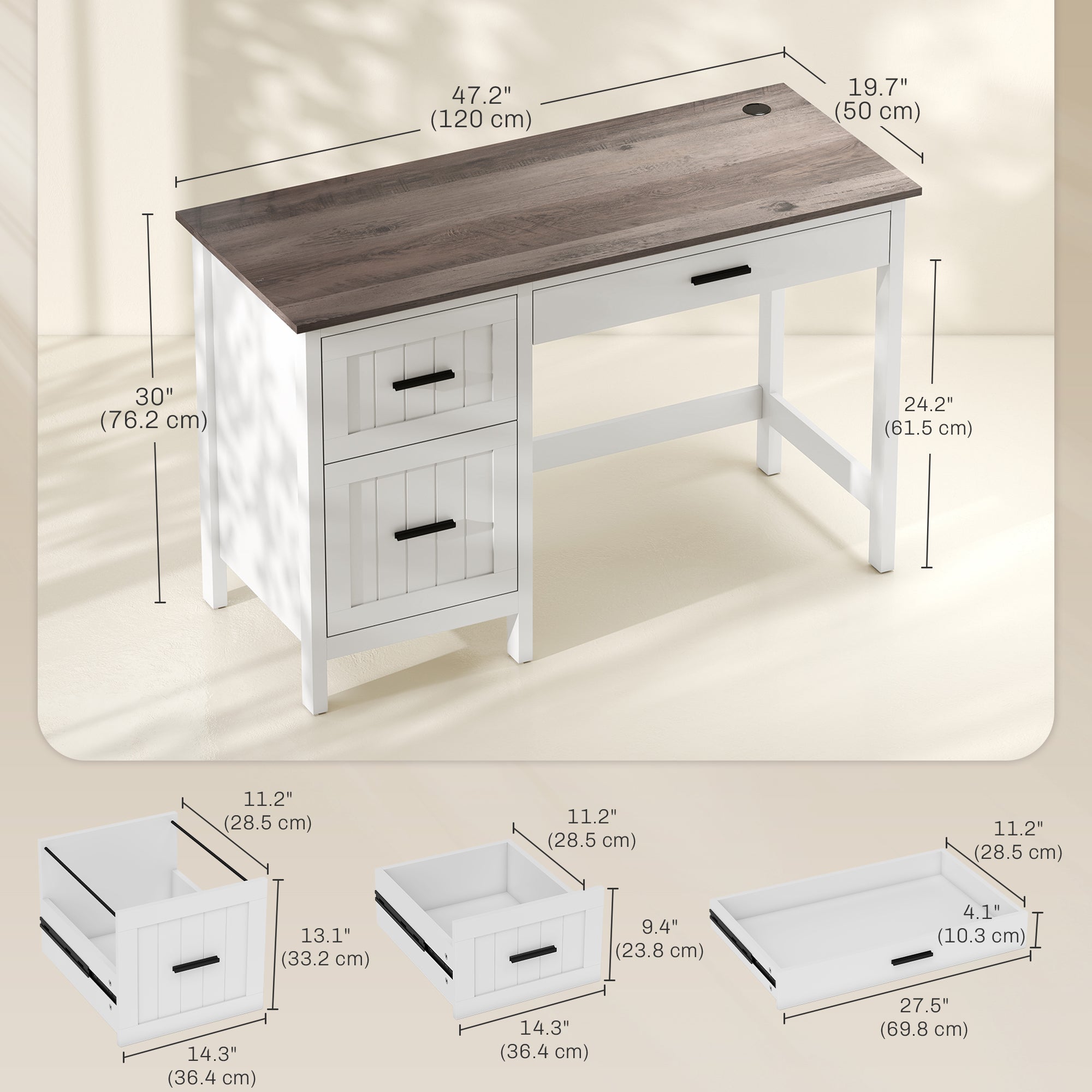 Comfort and design: This desk combines rustic elegance with modern functionality. Its brown wood top with subtle grain and white frame create a warm and inviting atmosphere, perfect for a home office or study. Thanks to its spacious and uncluttered design, it offers an inspiring work environment, ideal for boosting productivity while adding a touch of country charm to your interior décor.
