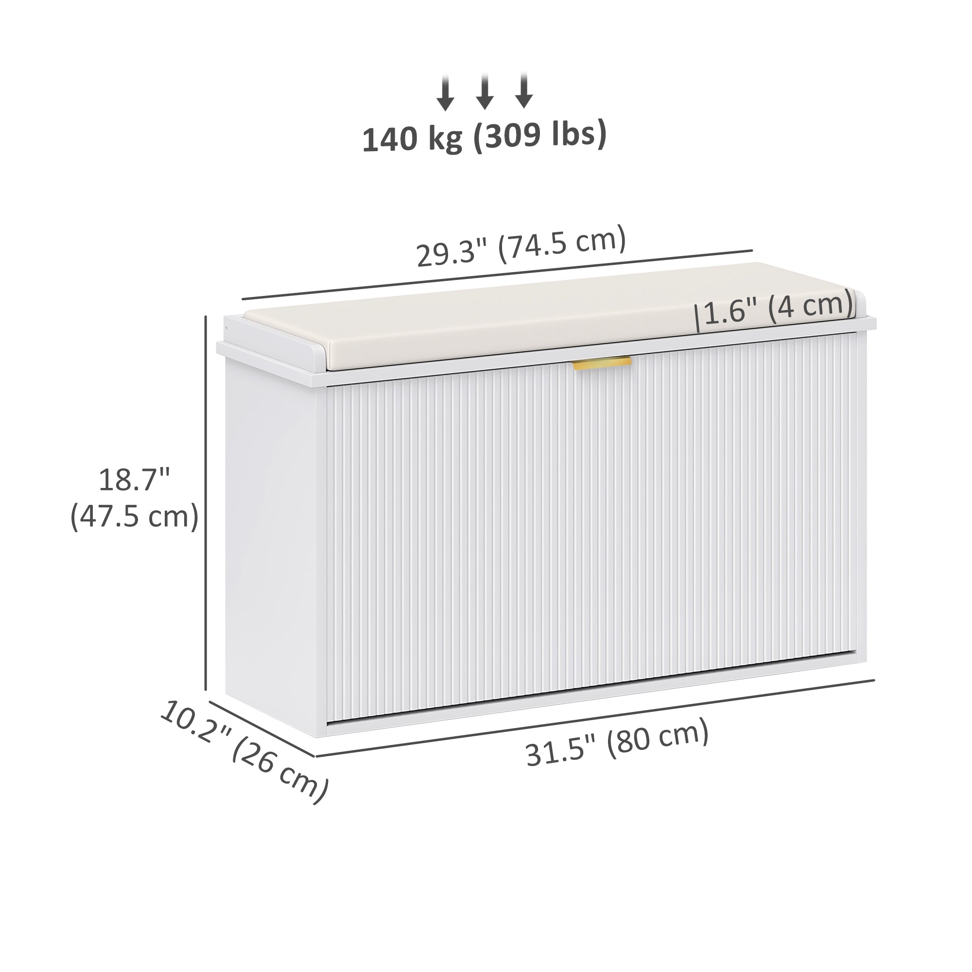 - Entryway Bench Information: Overall Dimensions: 31.5"W x 10.2"D x 18.7"H. Weight Capacity: 265 lbs (seat), 22 lbs (each cabinet). Assembly required.