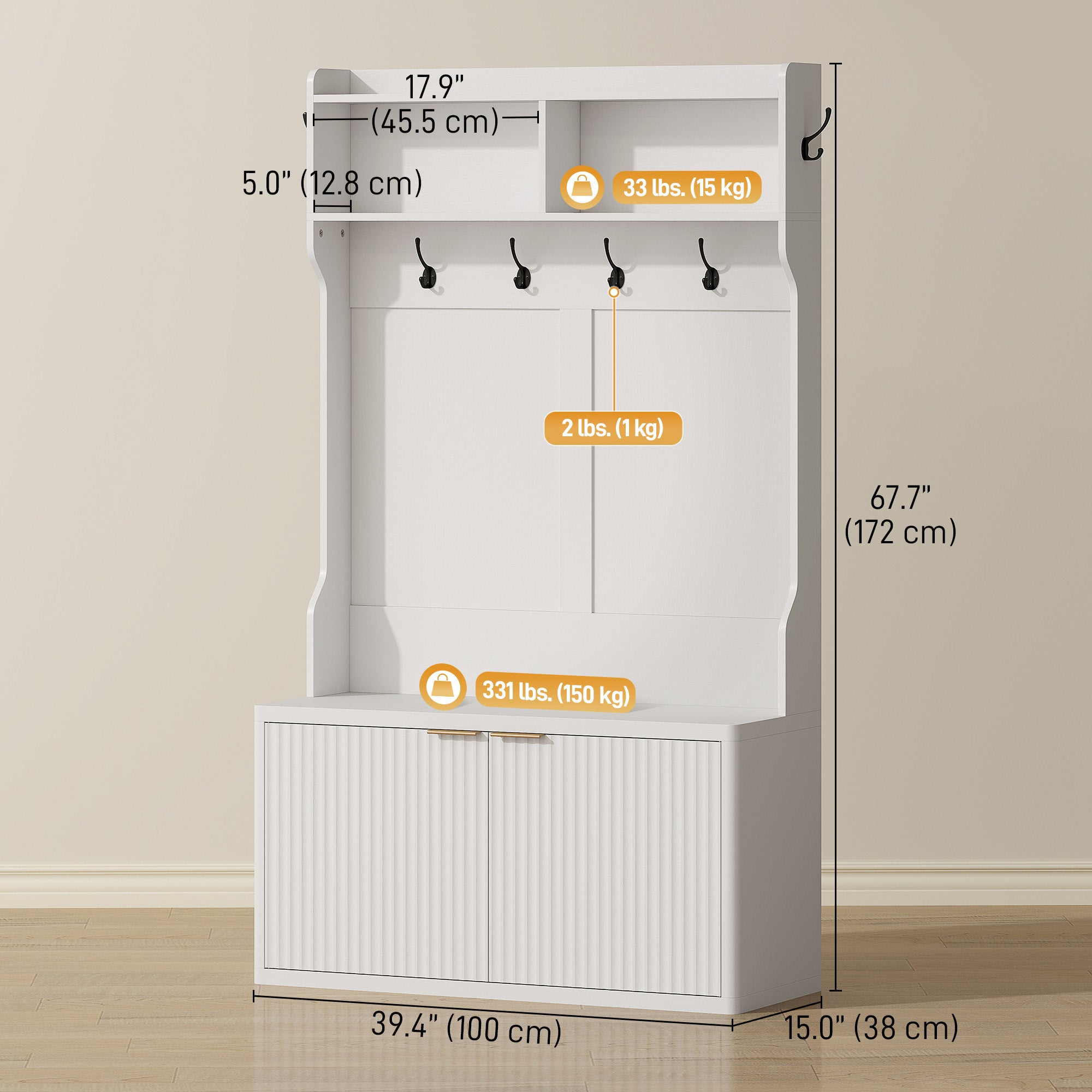 This practical piece of furniture combines four essential functions: a coat rack, a shoe bench, open storage compartments, and a shoe cabinet. Front and side hooks allow you to hang coats, bags, or accessories, while the lower cabinet can hold up to 10 pairs of shoes. The upper shelves provide ideal space for bags, hats, or decorative items.