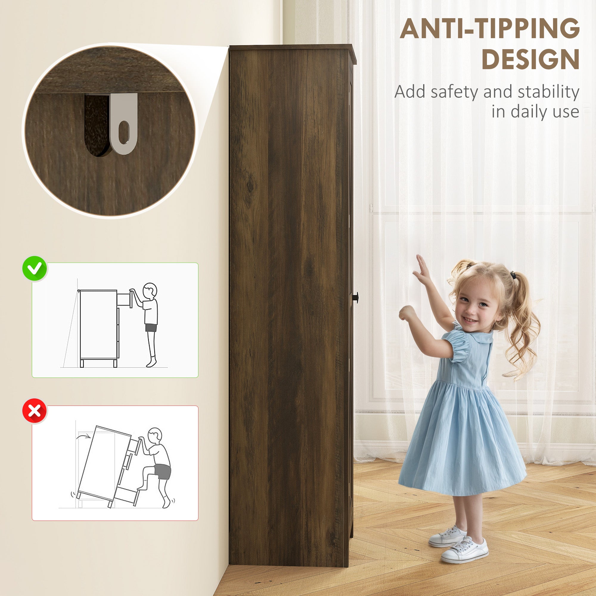 Safety and durability: Made from sturdy MDF and particleboard, this piece of furniture ensures strength and longevity. Its magnetic door makes opening and closing easy, while its anti-tip system ensures optimal safety.
