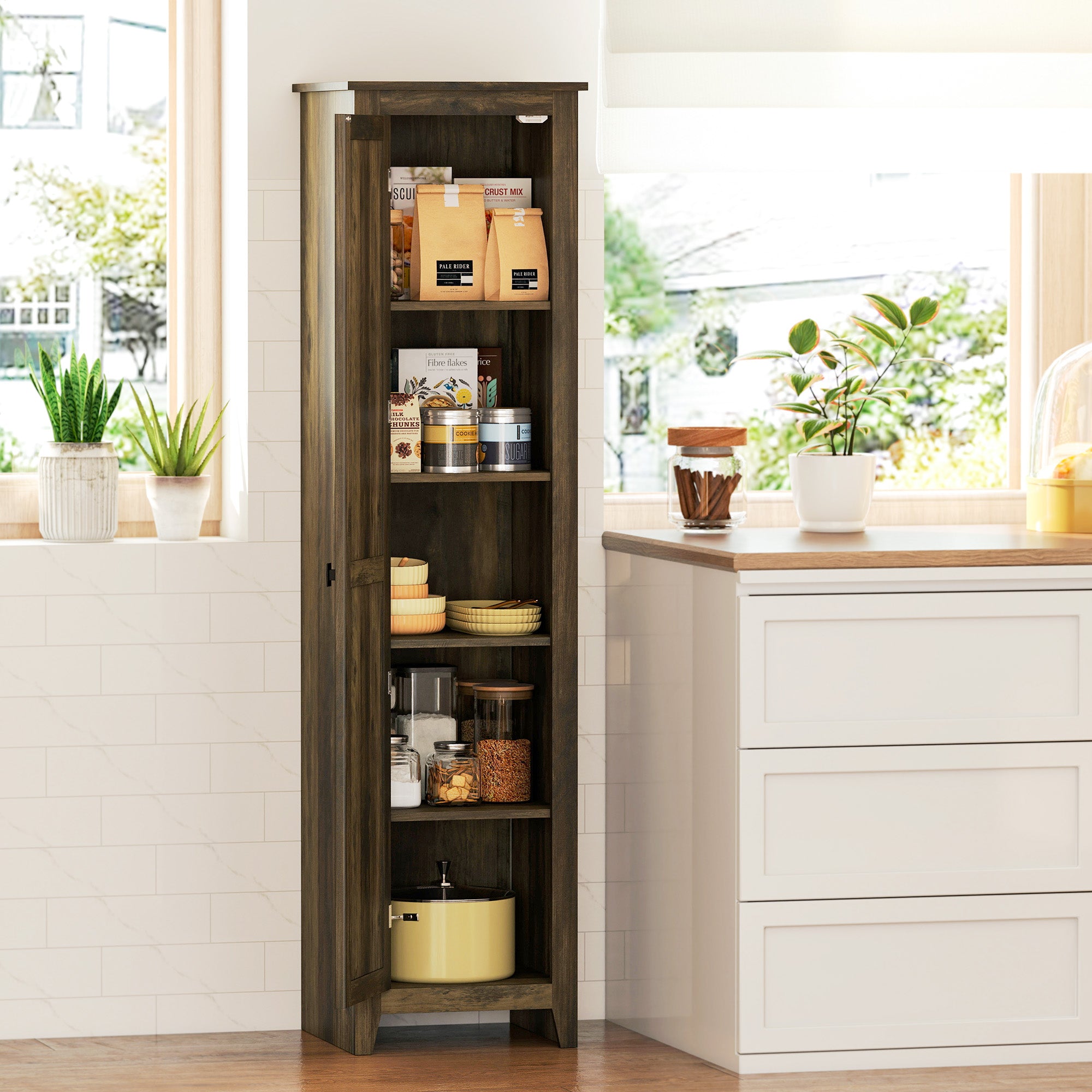 Brown Wood Grain Kitchen Storage Cabinet - 5-Tier Compact Pantry with Adjustable Shelves