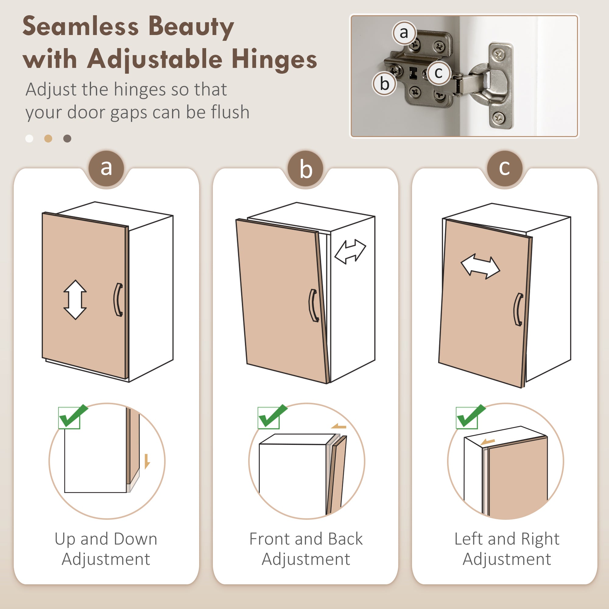 Quality Materials: Made of sturdy MDF, this cabinet guarantees stability and longevity. Its painted surface is durable and easy to clean, perfect for daily use. Adjustable hinges allow for precise door alignment, and the anti-tip device ensures optimal safety. Additional feet enhance stability, even when the cabinet is loaded.