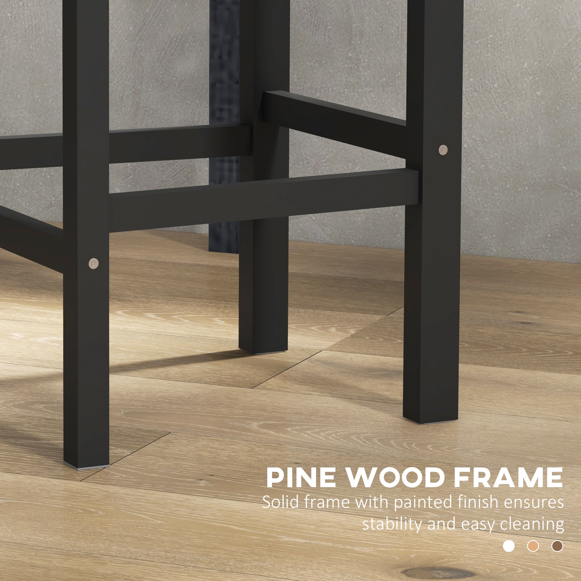 High-quality materials: Made from solid pine wood, they guarantee stability and durability. Their black painted finish protects the surface against moisture and stains, while the non-slip tips prevent scratches on your floors.