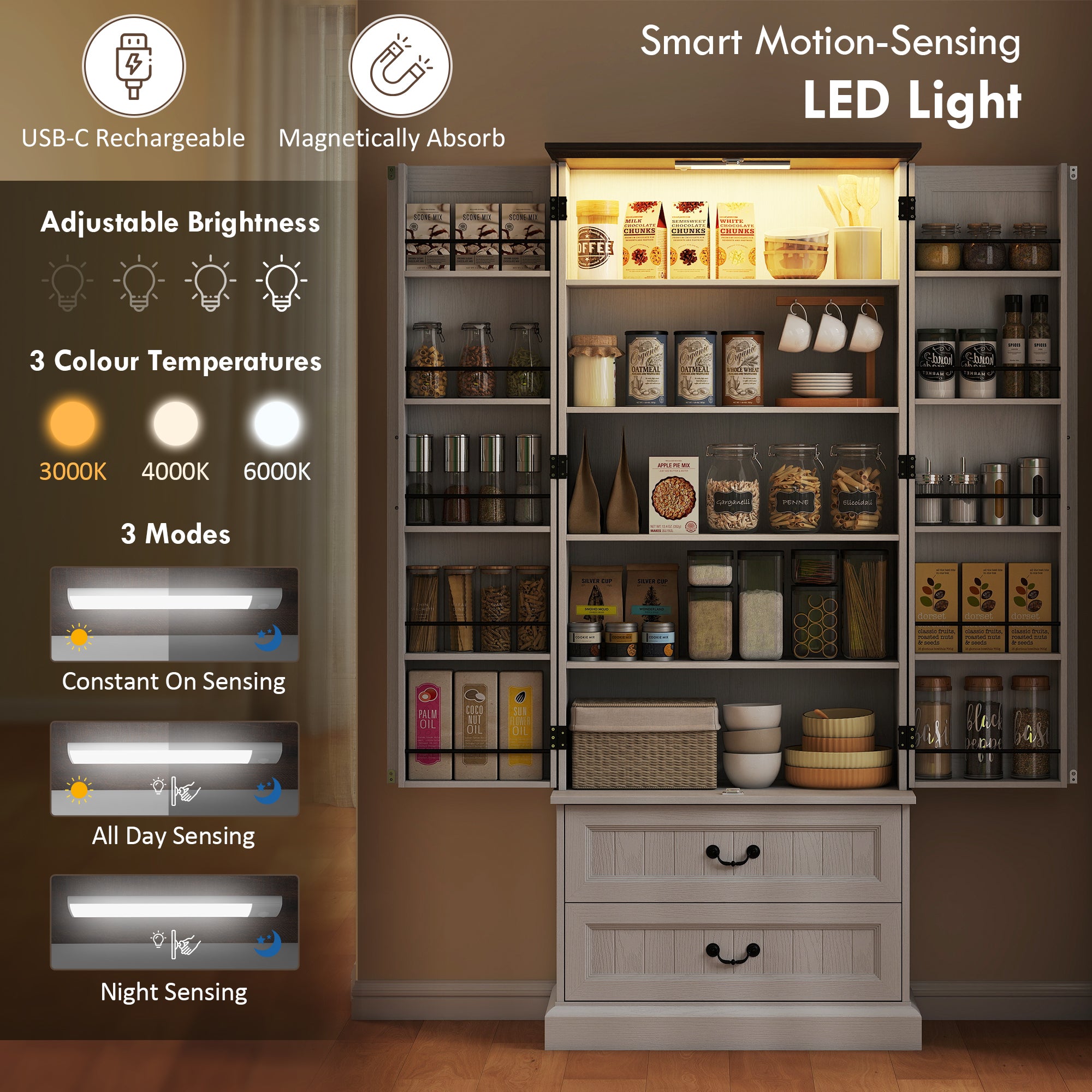 - Motion sensor LED lighting with 3 modes and adjustable brightness