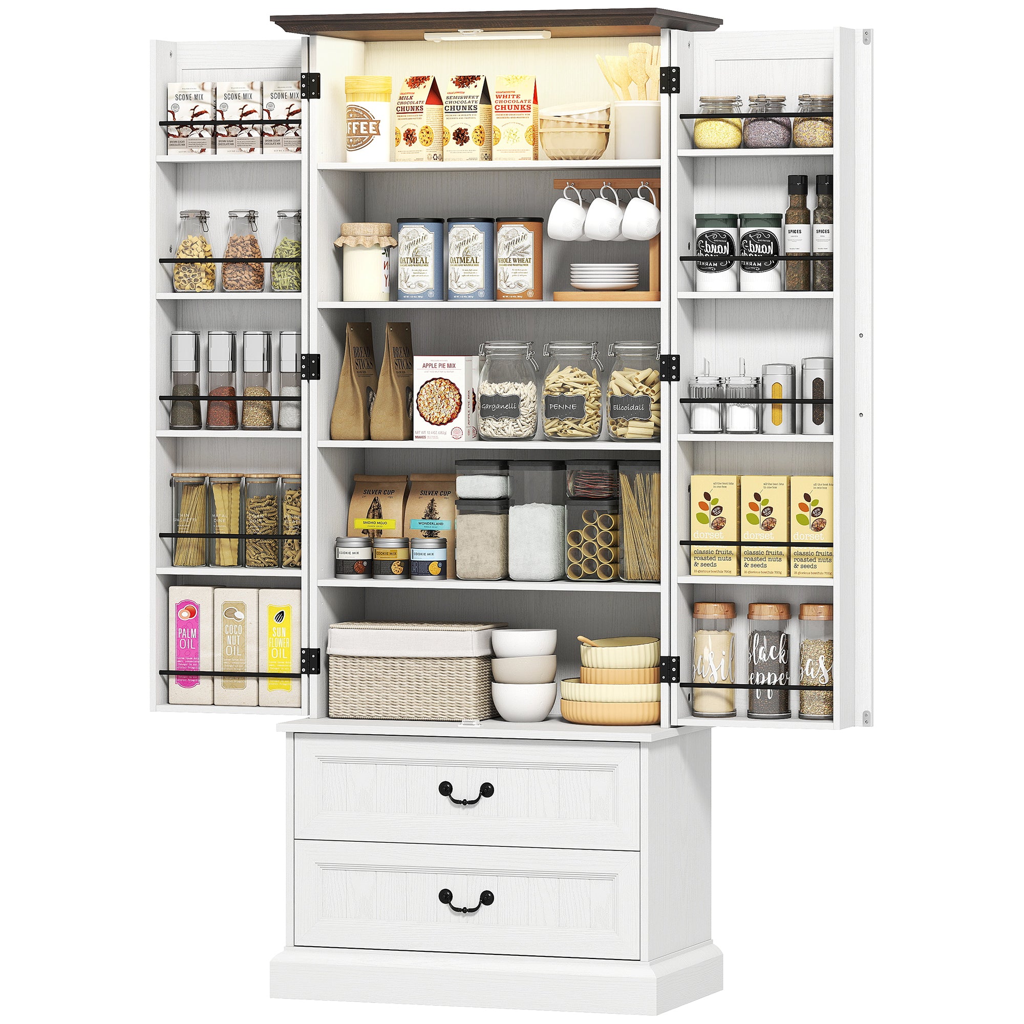 Rustic charm and modern elegance: With its farmhouse style and brown wood accents, this pantry brings a warm, handcrafted touch to your home. Its chic, natural look fits equally well in a country kitchen or contemporary decor.