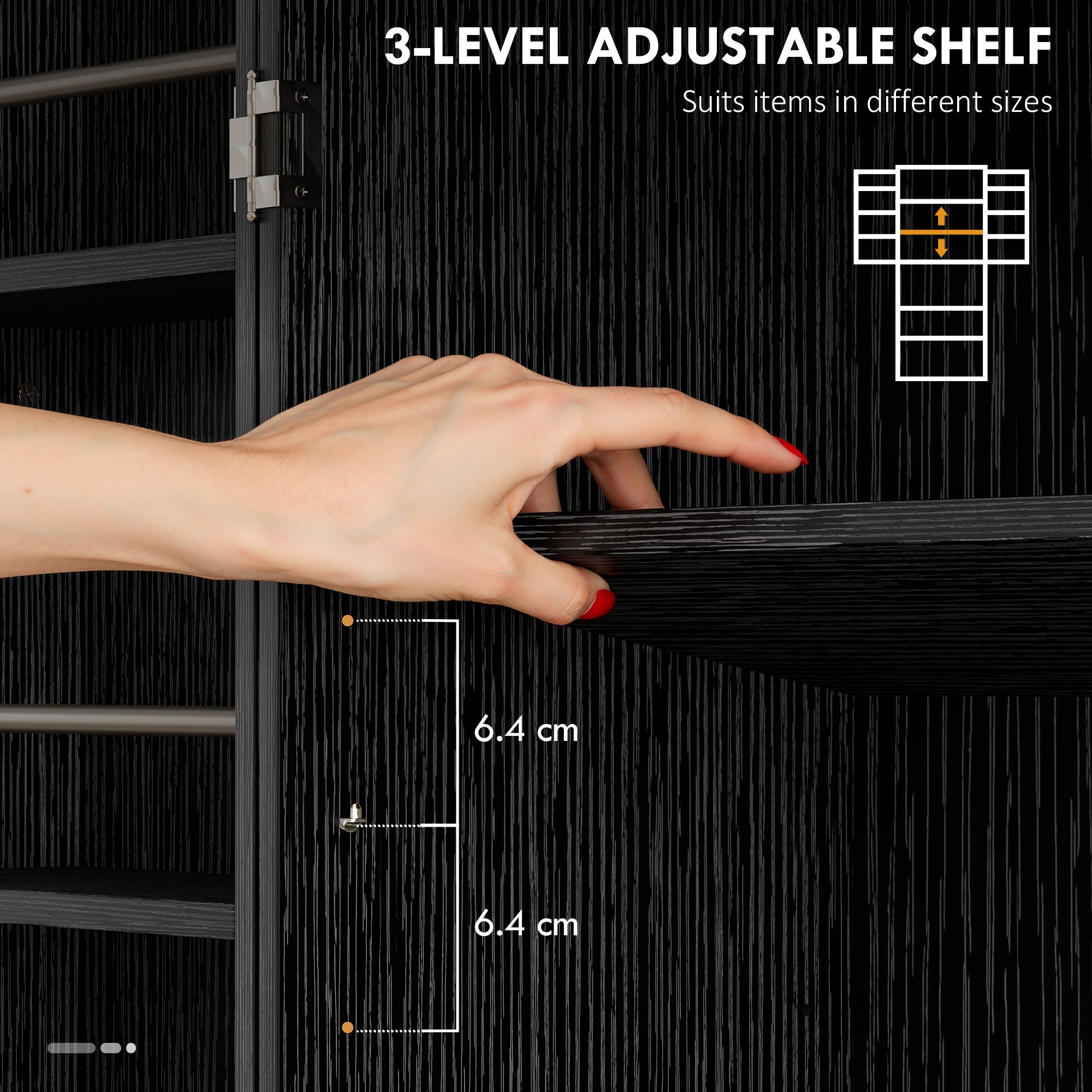 - Three-tier adjustable shelf for items of different heights