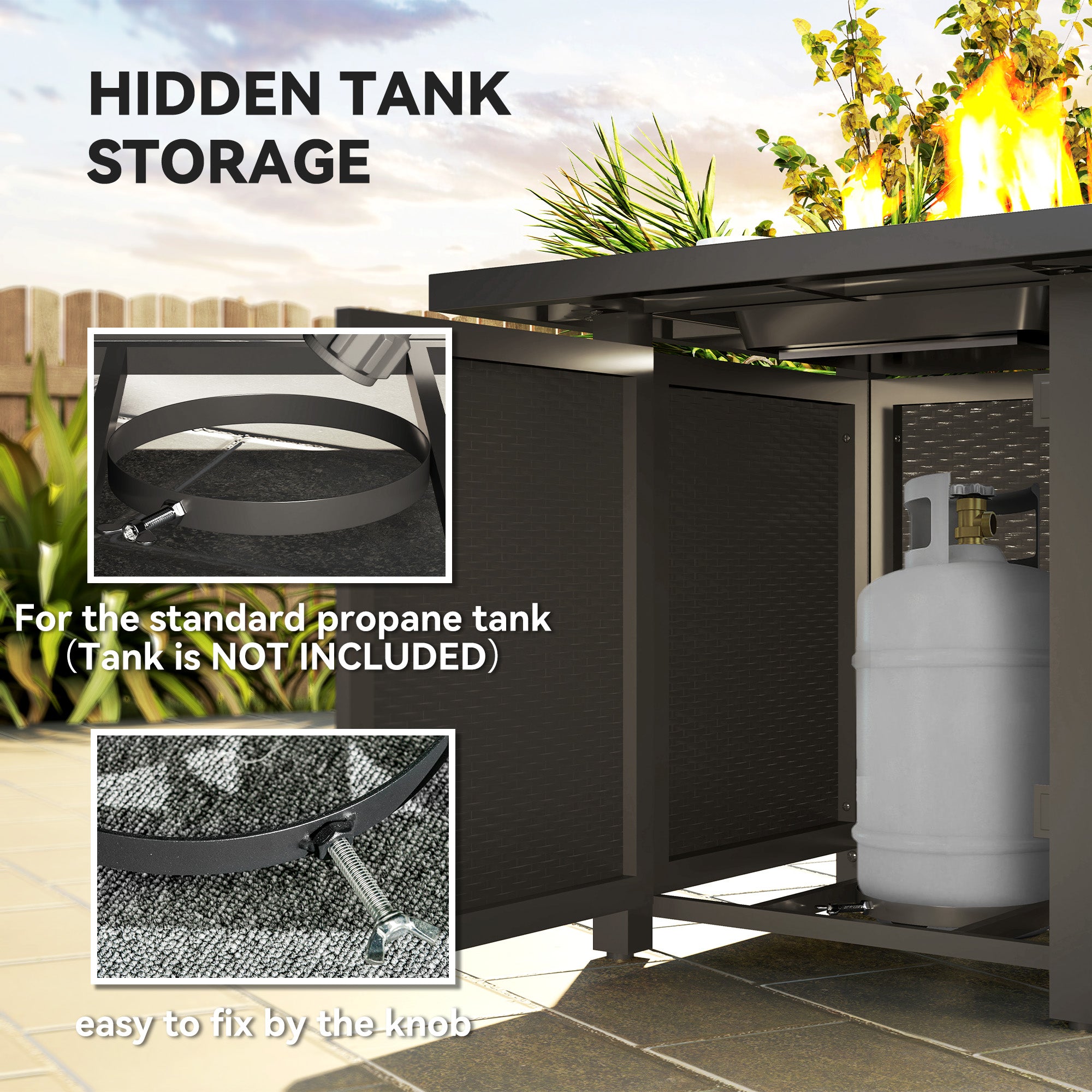 - Gas Supply: Natural gas tank, easy to install at the base of the garden fire pit. Protected by a door to keep it out of sight.