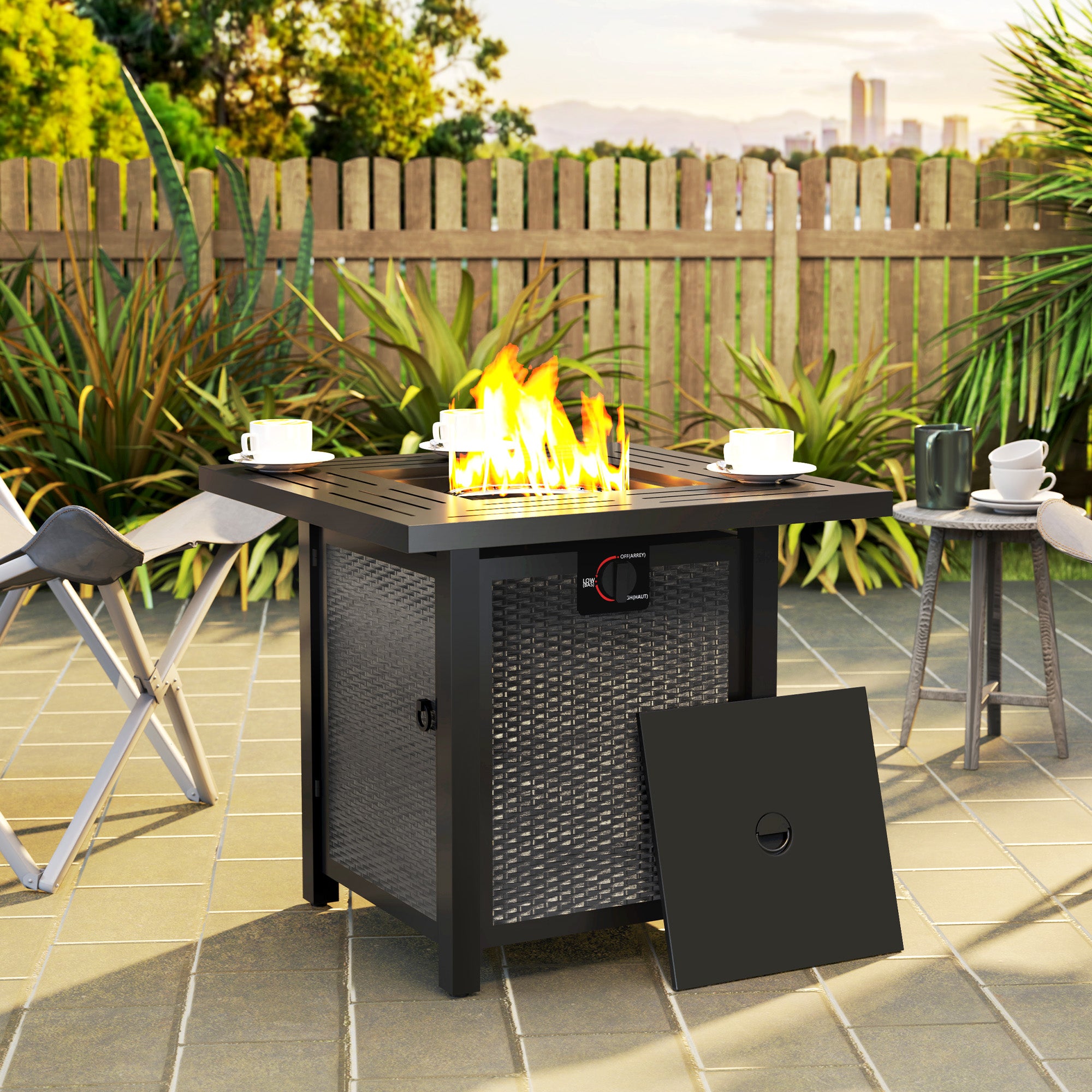- Duo Design: Both a gas fire pit and an outdoor dining table, it offers two functions in a compact size. Lid to cover the smokeless fire pit when used as a table.