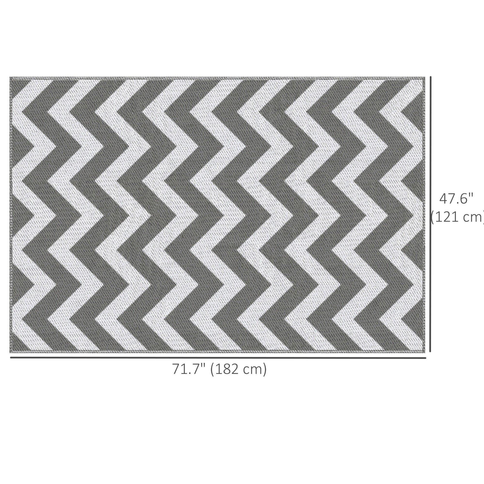 - RV Mat Information: Dimensions: 71.7" L x 47.6" W x 0.1" H (182 x 121 x 0.3 cm). NOTE: This outdoor mat is not fireproof, please keep it away from fire.