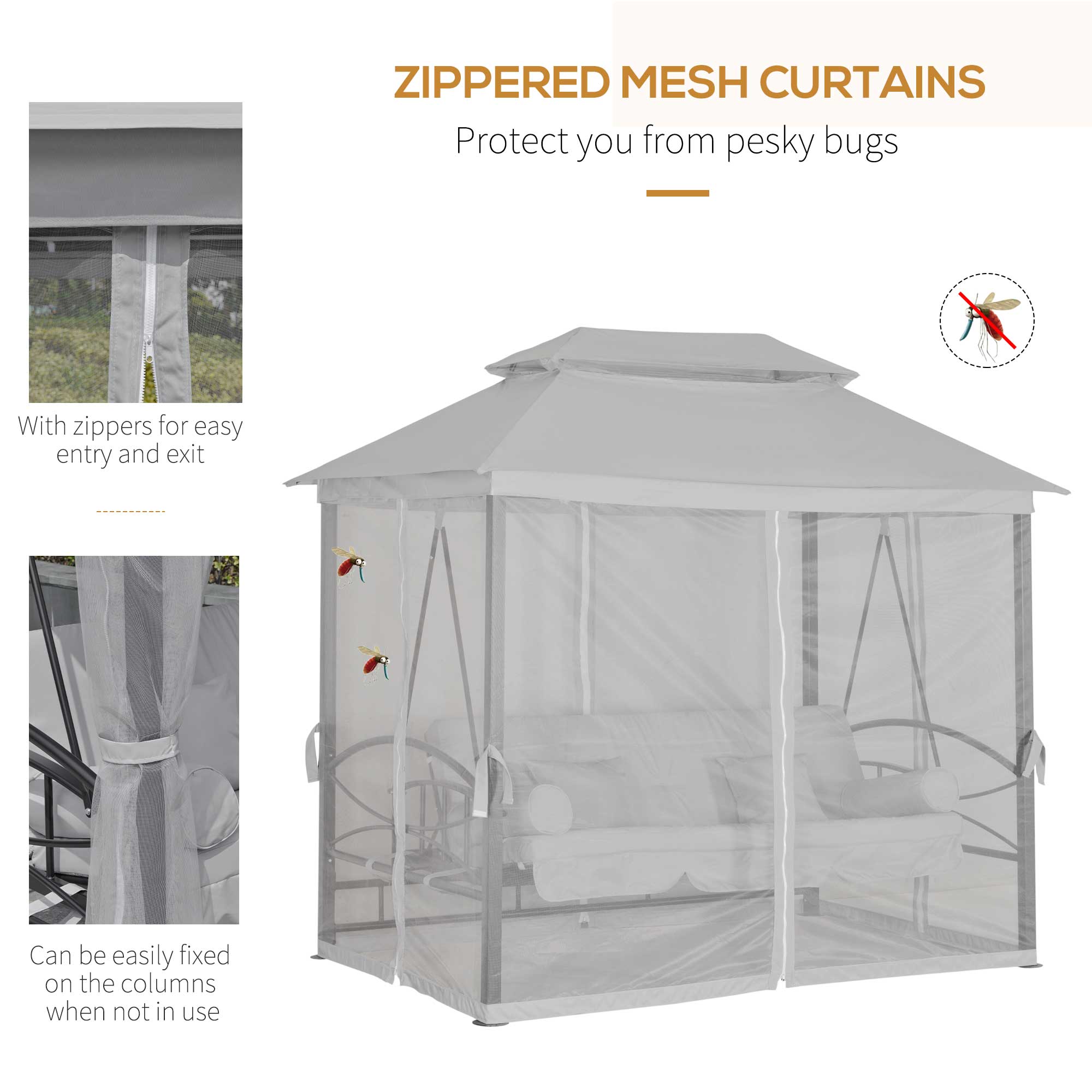 - Double-Vented Roof: The outdoor swing chair features a stylish double-vented roof that allows for better ventilation, heat reduction, and reduced wind stress. The garden swing also comes with a mesh netting.