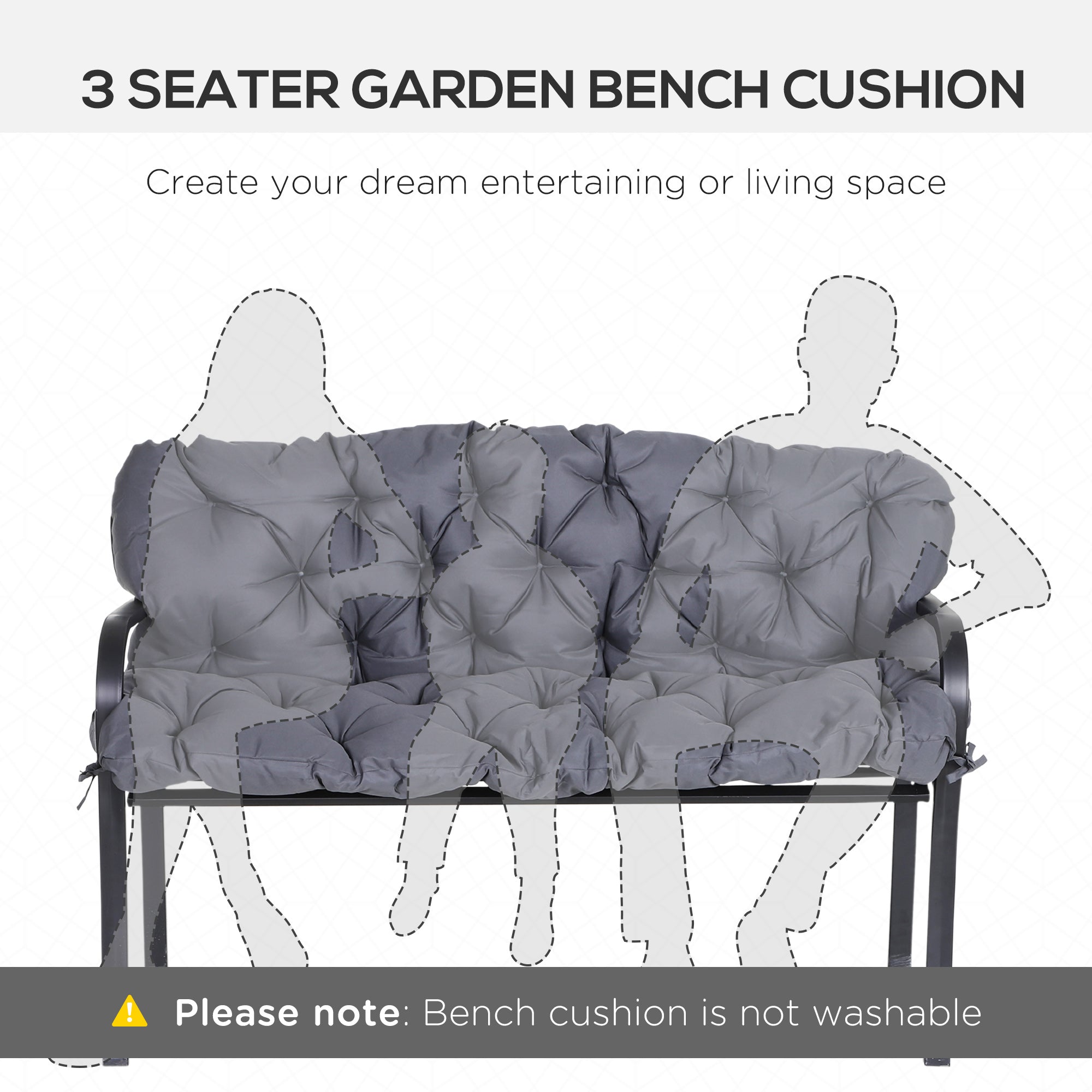- Patio Cushion Dimensions: Overall Dimensions: 38.6" L x 59.1" W x 3.1" D (98 x 150 x 8 cm). Note: The bench cushion is not washable.