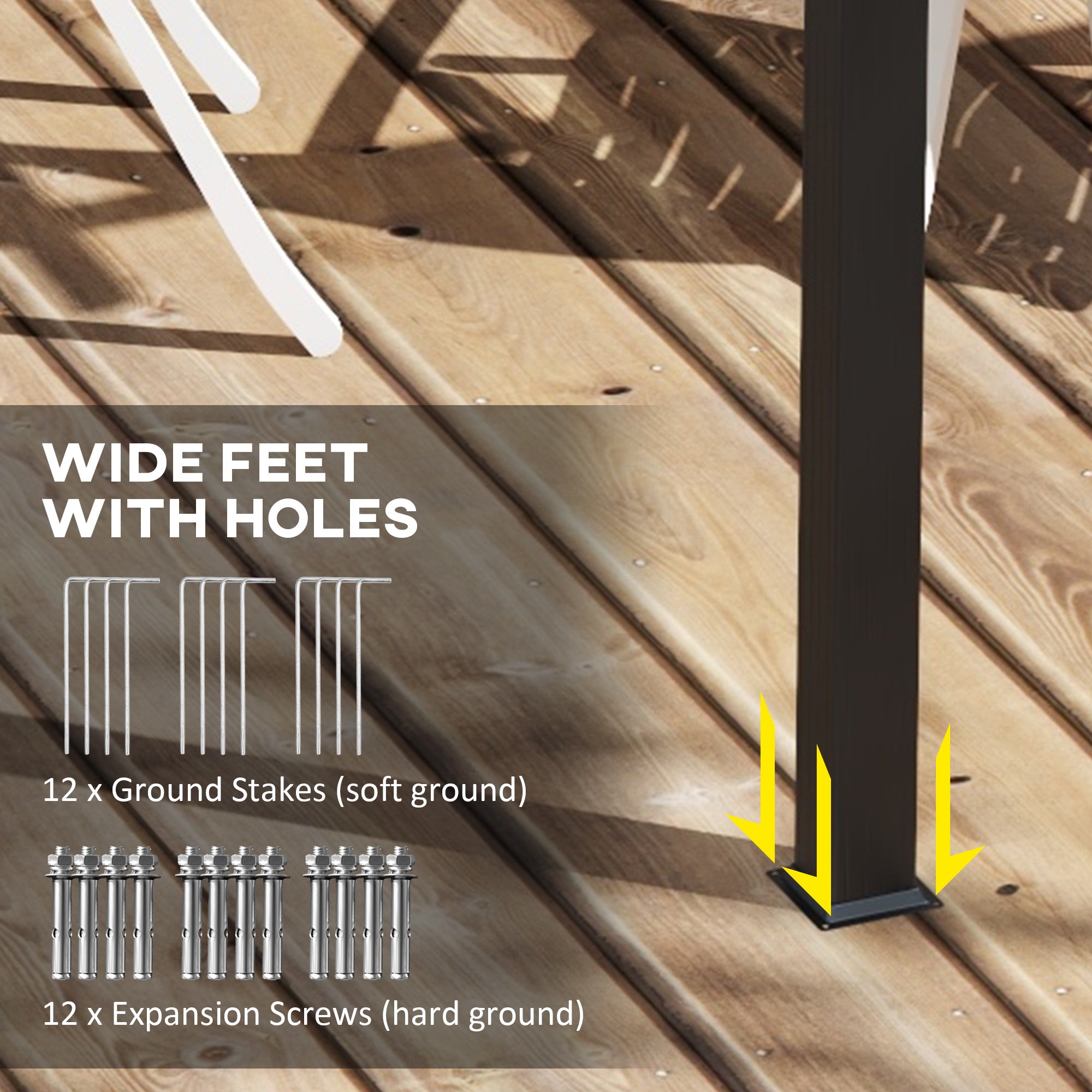 - All-terrain: 12 stakes and 12 expansion screws allow you to secure our aluminum pergola to soft or hard ground. Simply insert the stabilizer into the pergola's wide feet.