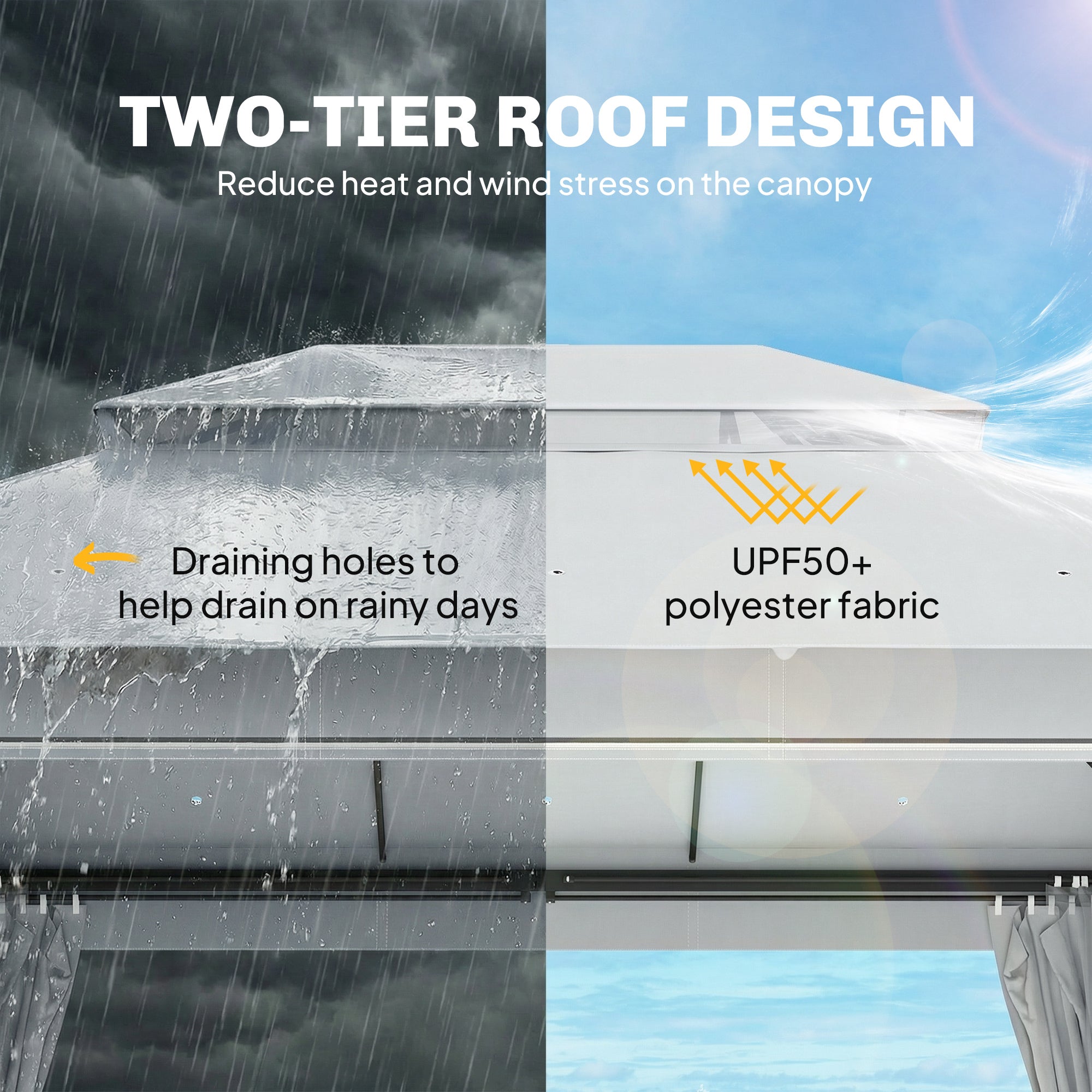 Designed with a powder-coated steel frame, this gazebo ensures strength and durability in outdoor conditions. The polyester roof offers UPF50+ sun protection, while drainage holes prevent water accumulation for better longevity.