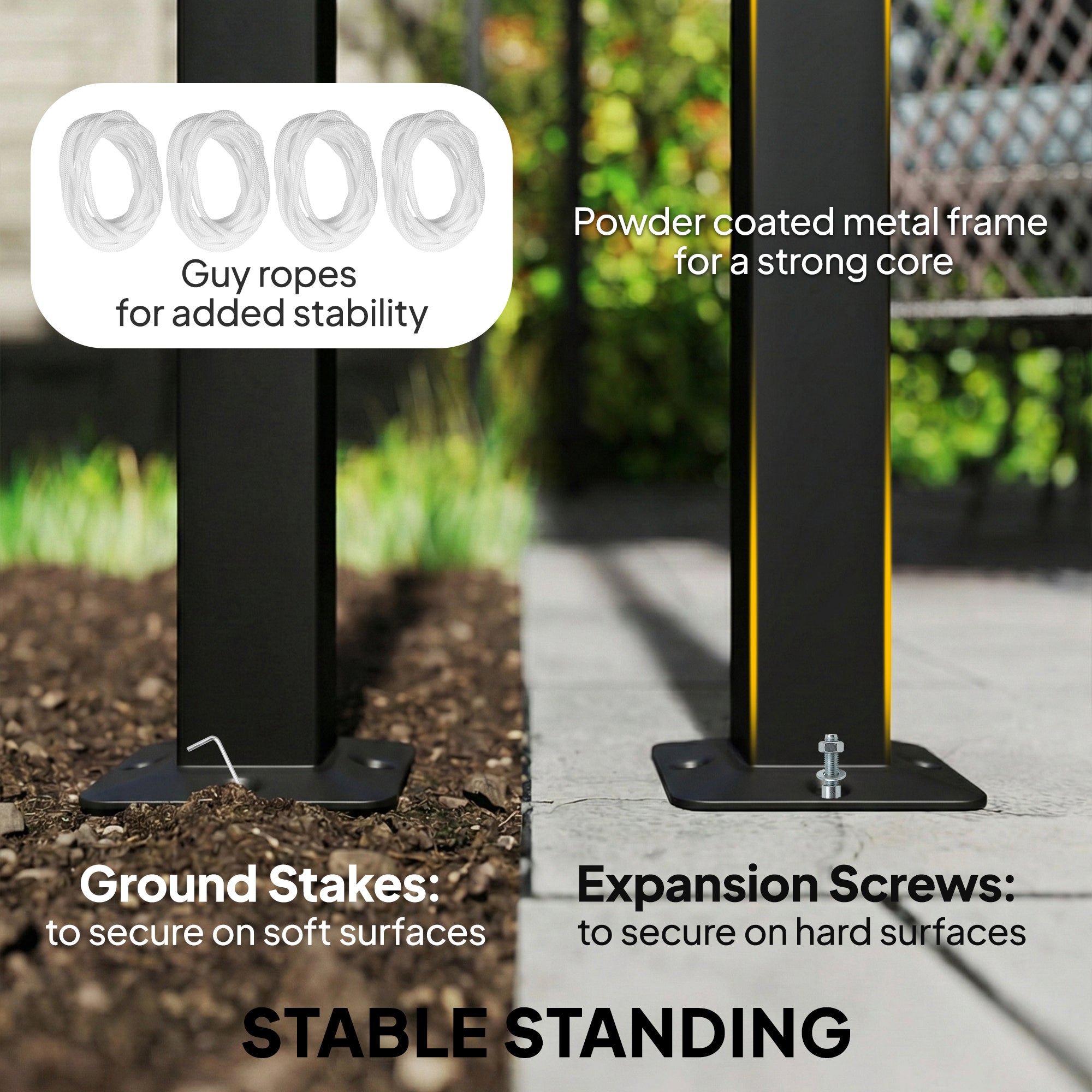 Installation is simple thanks to the provided accessories, including expansion screws, ground stakes, and guy ropes for optimal stability. Minimal maintenance is required to maintain its appearance and performance over time.