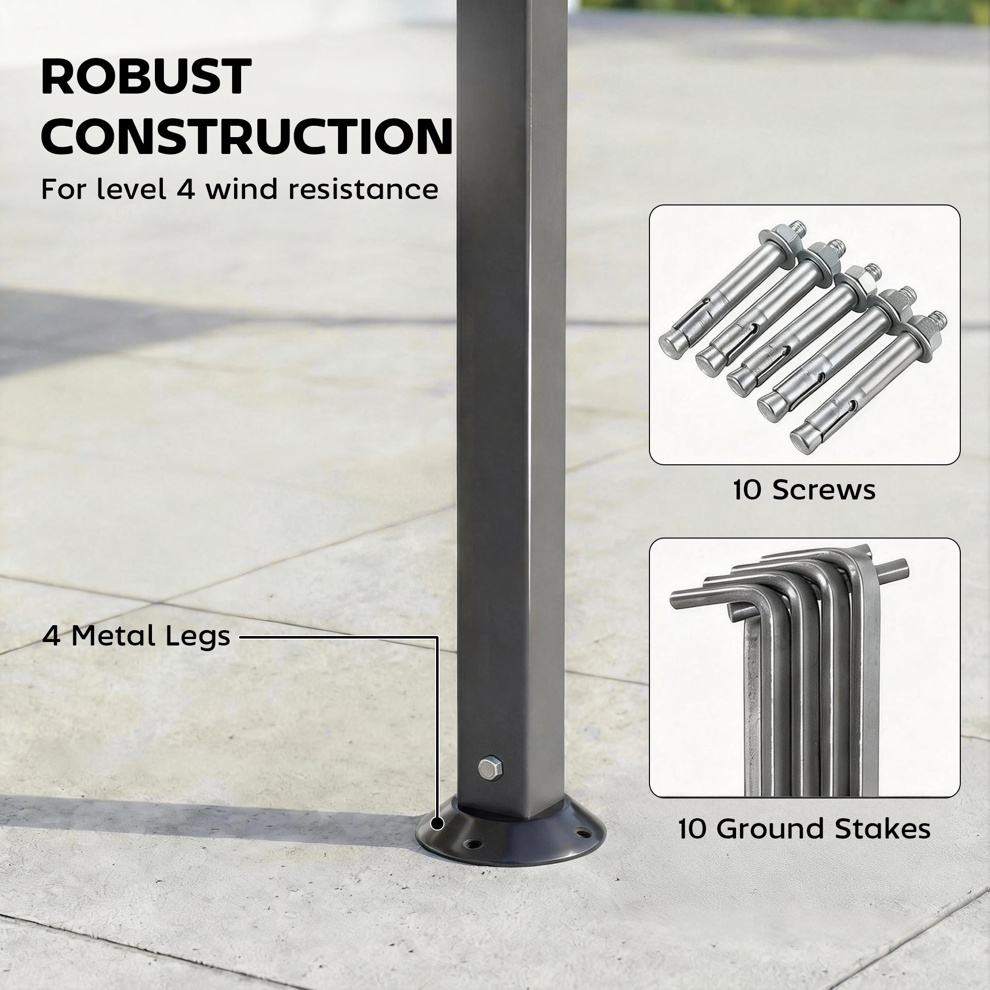 - Includes: 1 x gazebo, 10 ground stakes, 10 expansion screws, 1 manual