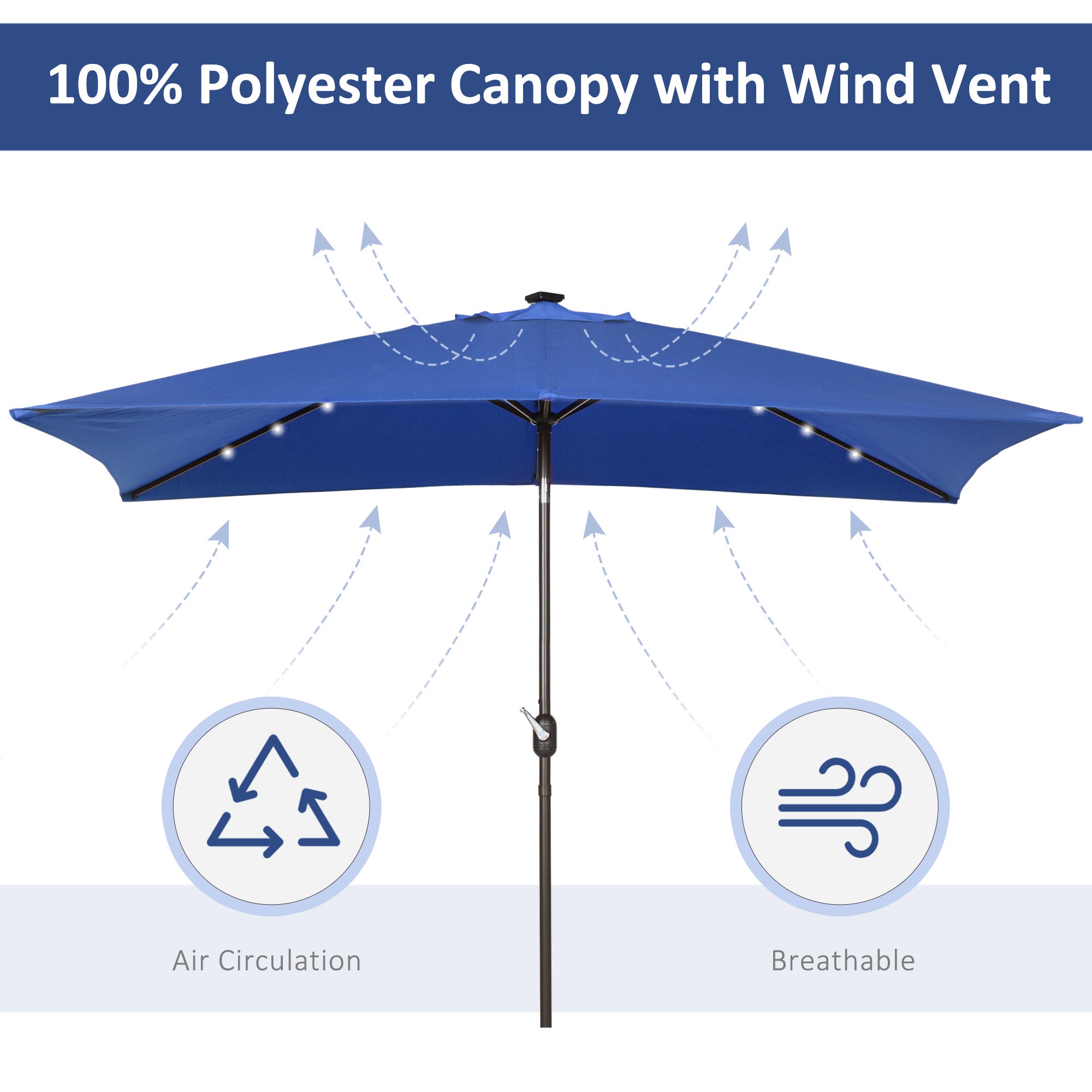 - LED Lighting: Bright and stylish, this 2m x 3m market umbrella features 20 white solar LEDs (6 per long rib and 2 per short rib). It provides bright, discreet lighting. Perfect for spending time with friends without disturbing the neighbors.