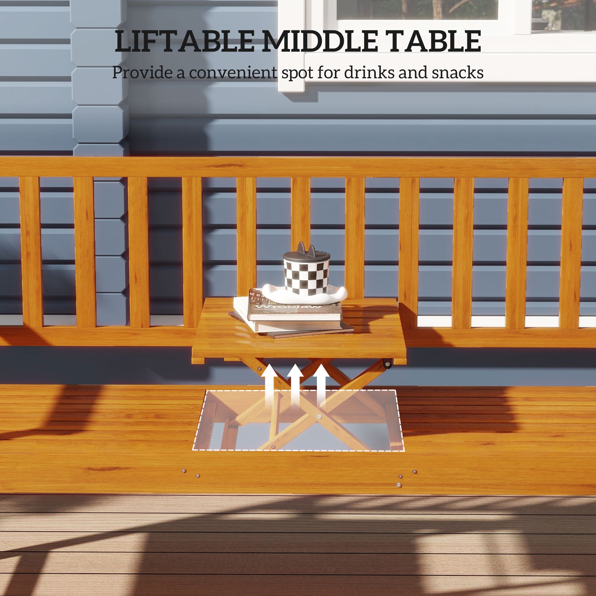 - Adjustable Table: Featuring a lift-up center table to provide a convenient spot for drinks and snacks, this patio bench is ideal for any outdoor gathering.