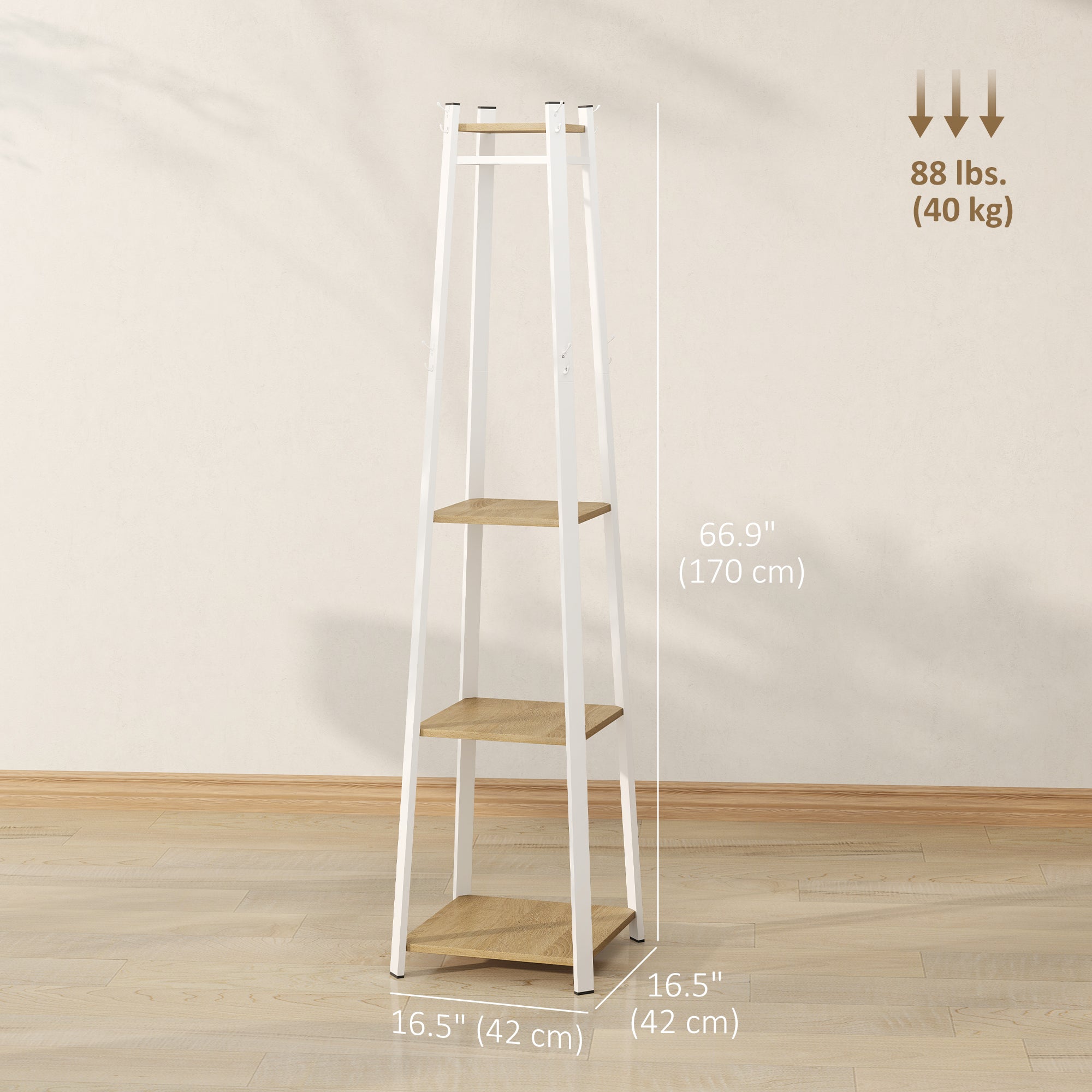 - Load capacity: 40 kg (88 lb) total, 5 kg (11 lb) per shelf, 2 kg (4.4 lb) per hook