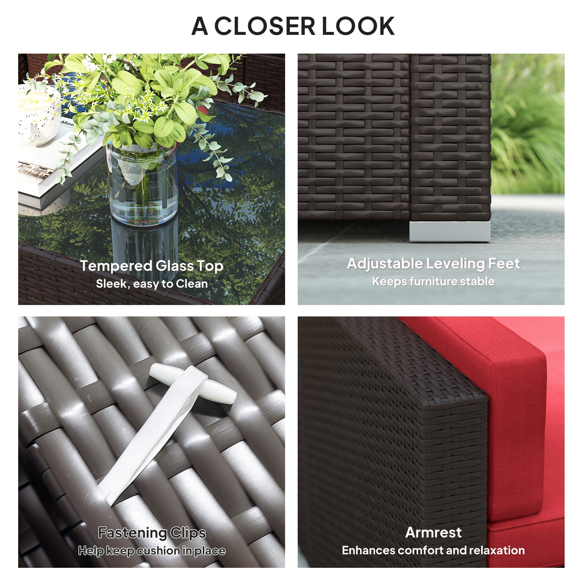 - Materials: Steel frame, synthetic rattan (PE), tempered glass, water-repellent polyester fabric