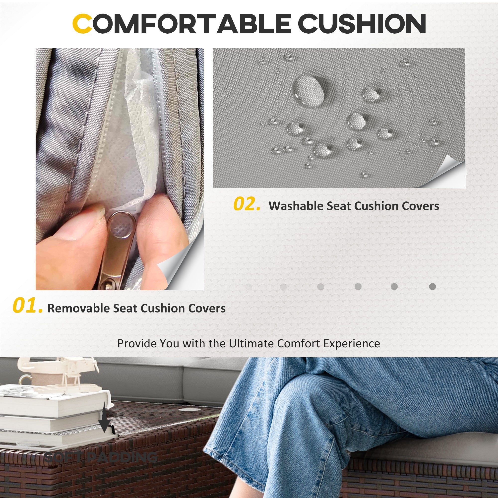 - Comfortable Seating: This outdoor lounge set features soft seat and back cushions for optimal comfort. The zippered cushion covers are removable and washable for improved hygiene. Adjustable glides ensure the sofa's balance and stability.