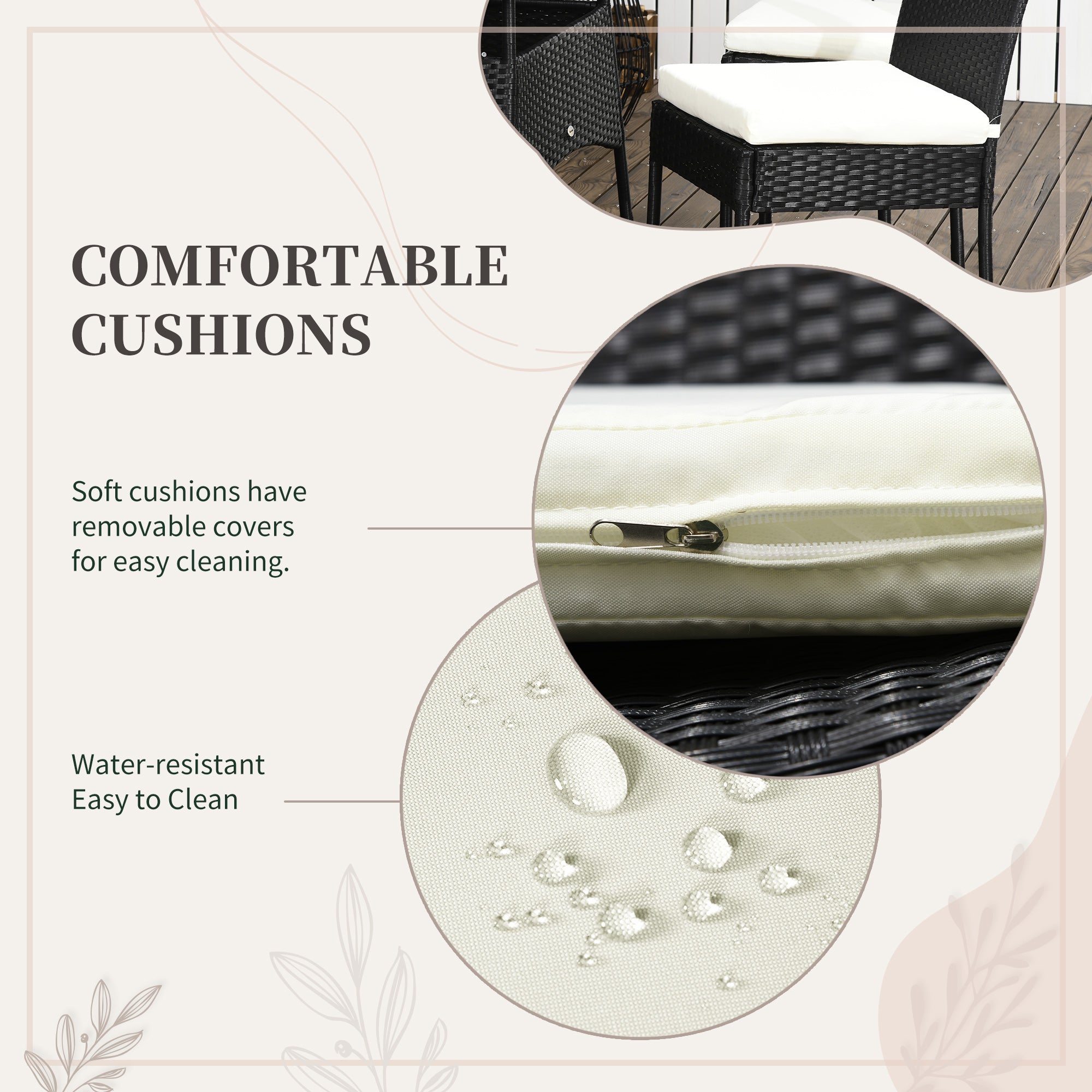 - Soft and elegant chair cushion: The high back and seats feature soft cushions for optimal comfort and long hours of relaxation. The cushion covers have zippers for easy removal and washing.