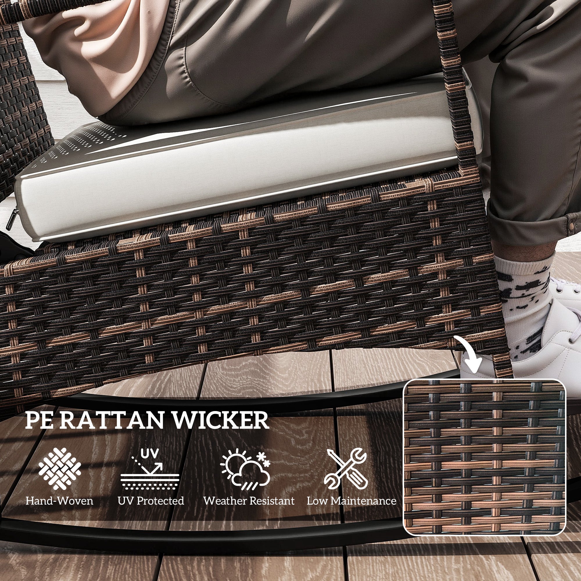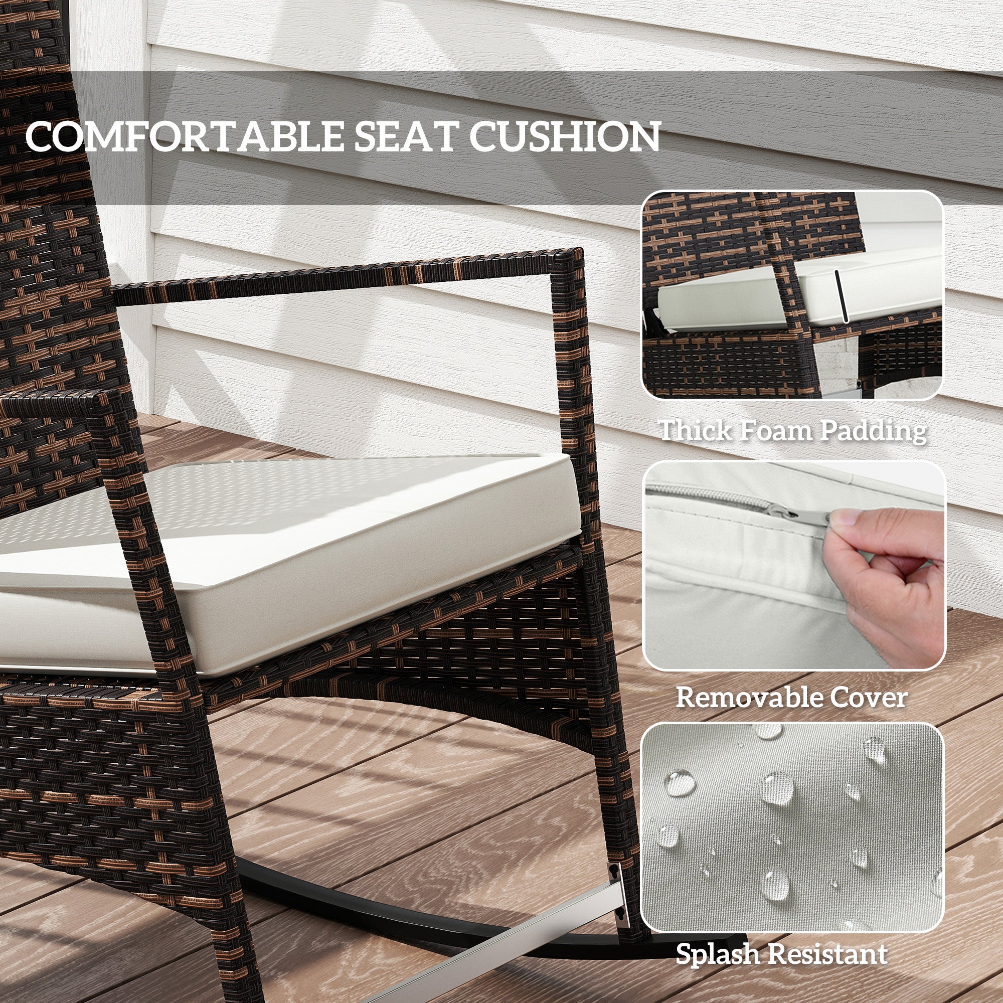 - 3-Piece Patio Set: This outdoor wicker patio furniture set comes with two reclining rocking chairs and a chic square table with glass top - great for intimate gatherings, morning coffee, or enjoying the sun on your small porch, deck, or balcony.