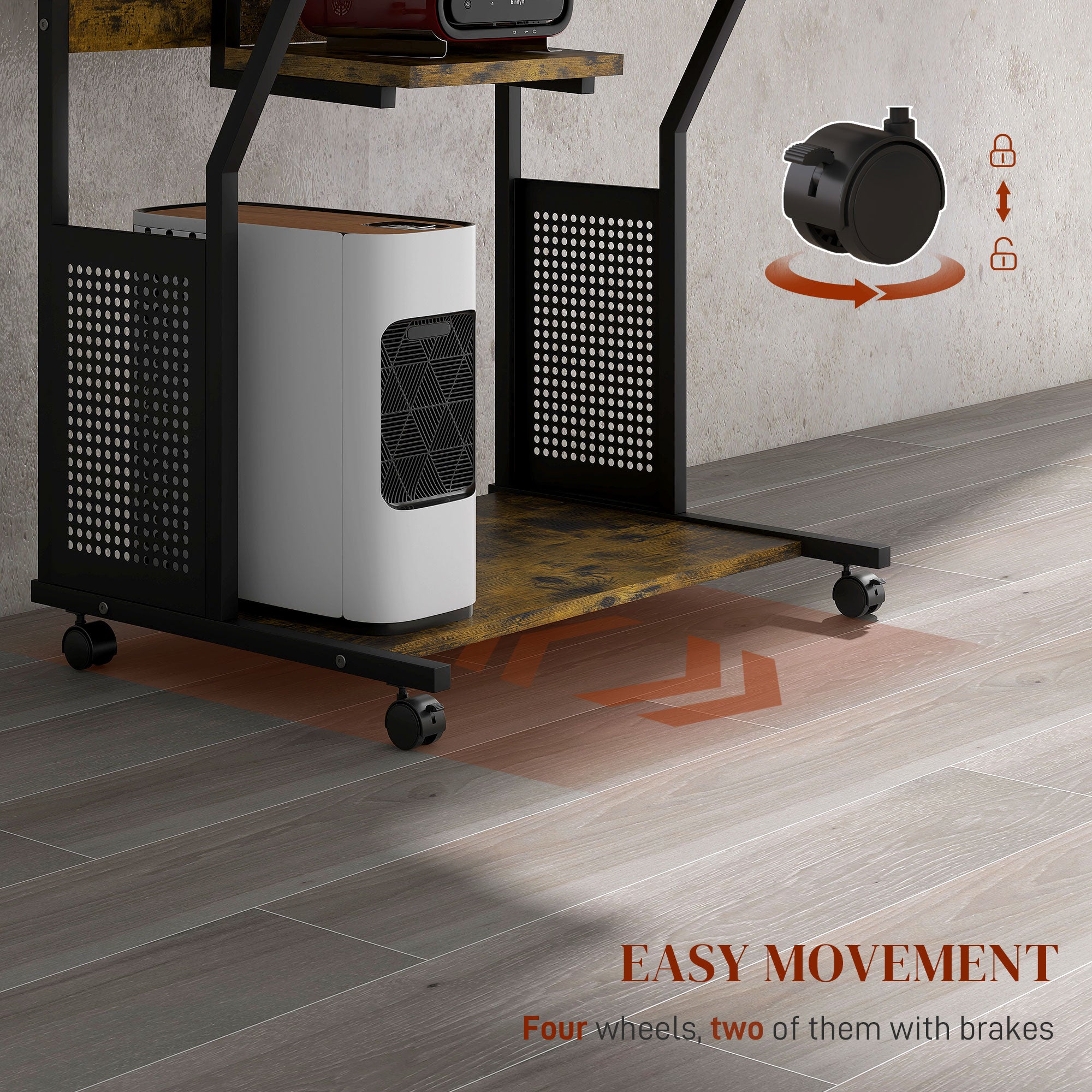 Computer desk with multi-layer storage and casters – Rustic brown and black