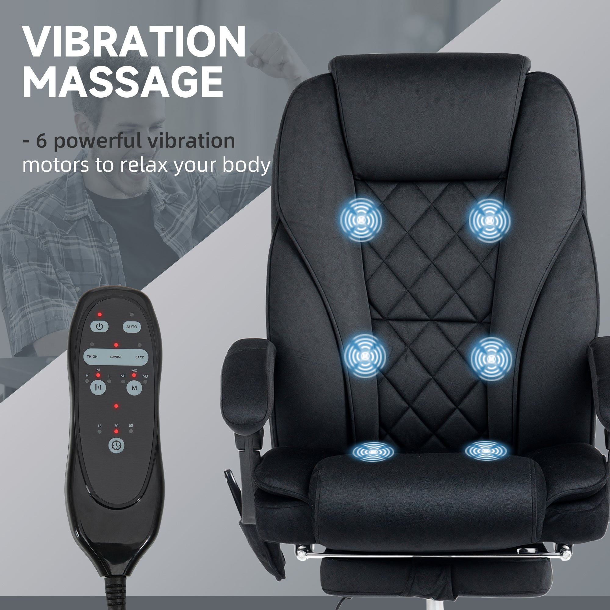 Relaxing massage: Enjoy six vibration massage points with three modes, three intensity levels, and a built-in timer for a personalized relaxation experience. The wired remote control allows you to easily adjust the settings and stores neatly in the chair's side pocket. It's the perfect solution for relieving stress and muscle tension.