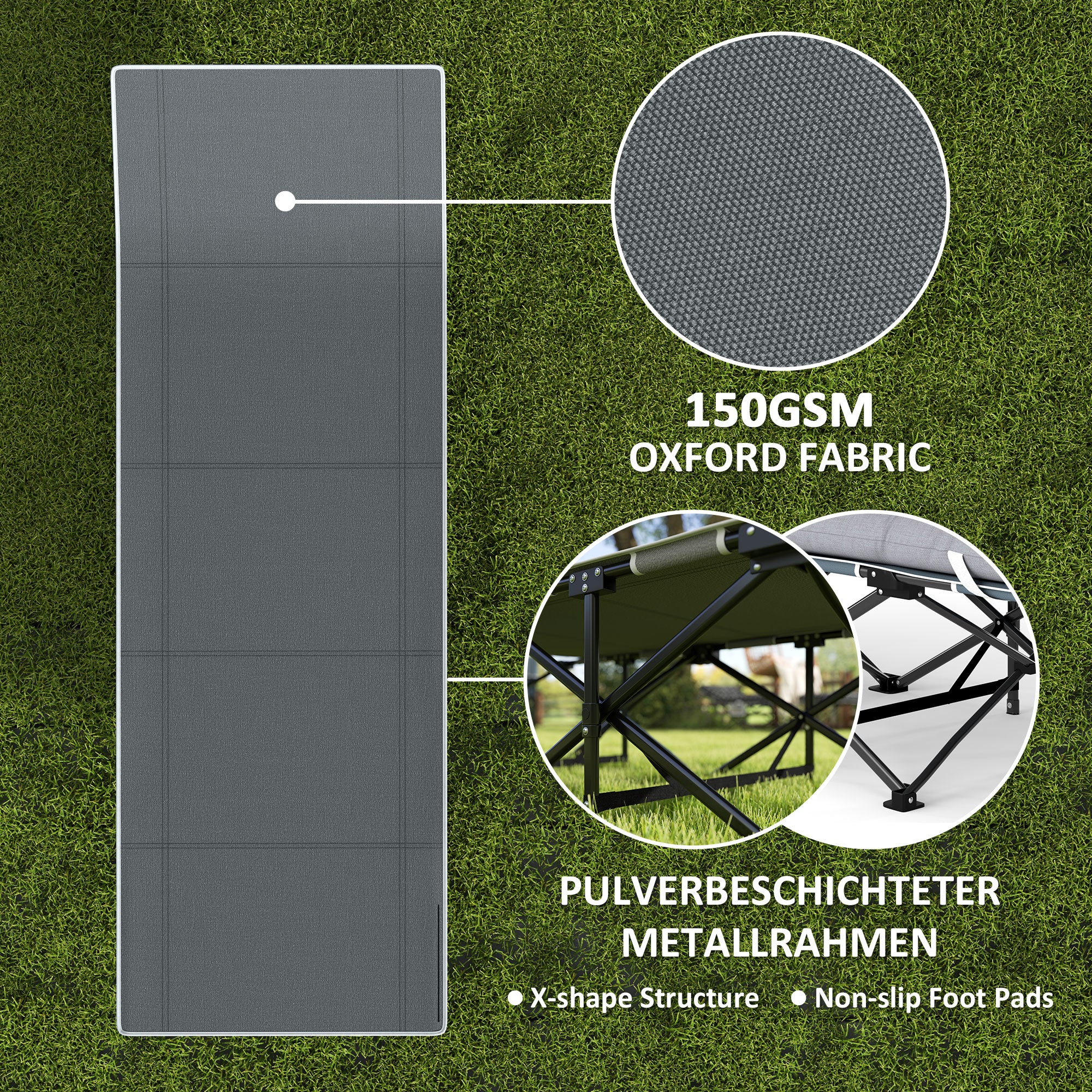 - Sturdy Construction: Made from 150g/㎡ splash-proof Oxford fabric and reinforced with a powder-coated metal X-frame, this cot is designed for stability and long-lasting support, with non-slip foot pads for added safety.