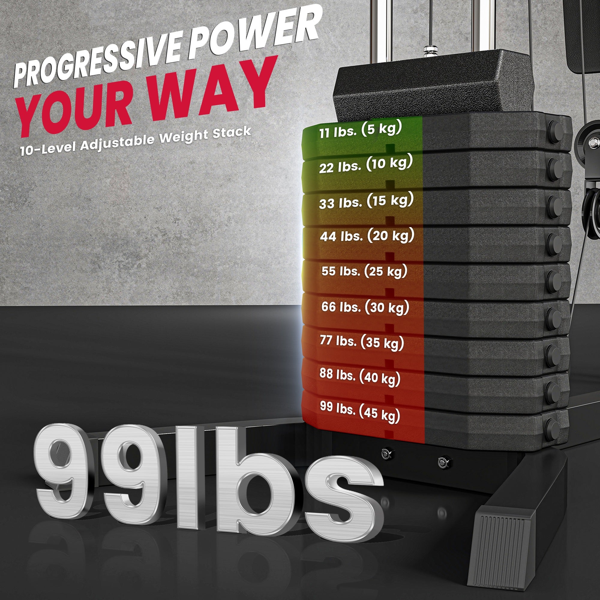 Designed with robust steel and PU finishes, this station ensures stability and durability. Its integrated 99 lb (45 kg) weight stack allows for easy resistance adjustment, while its solid structure supports up to 242 lb (110 kg).