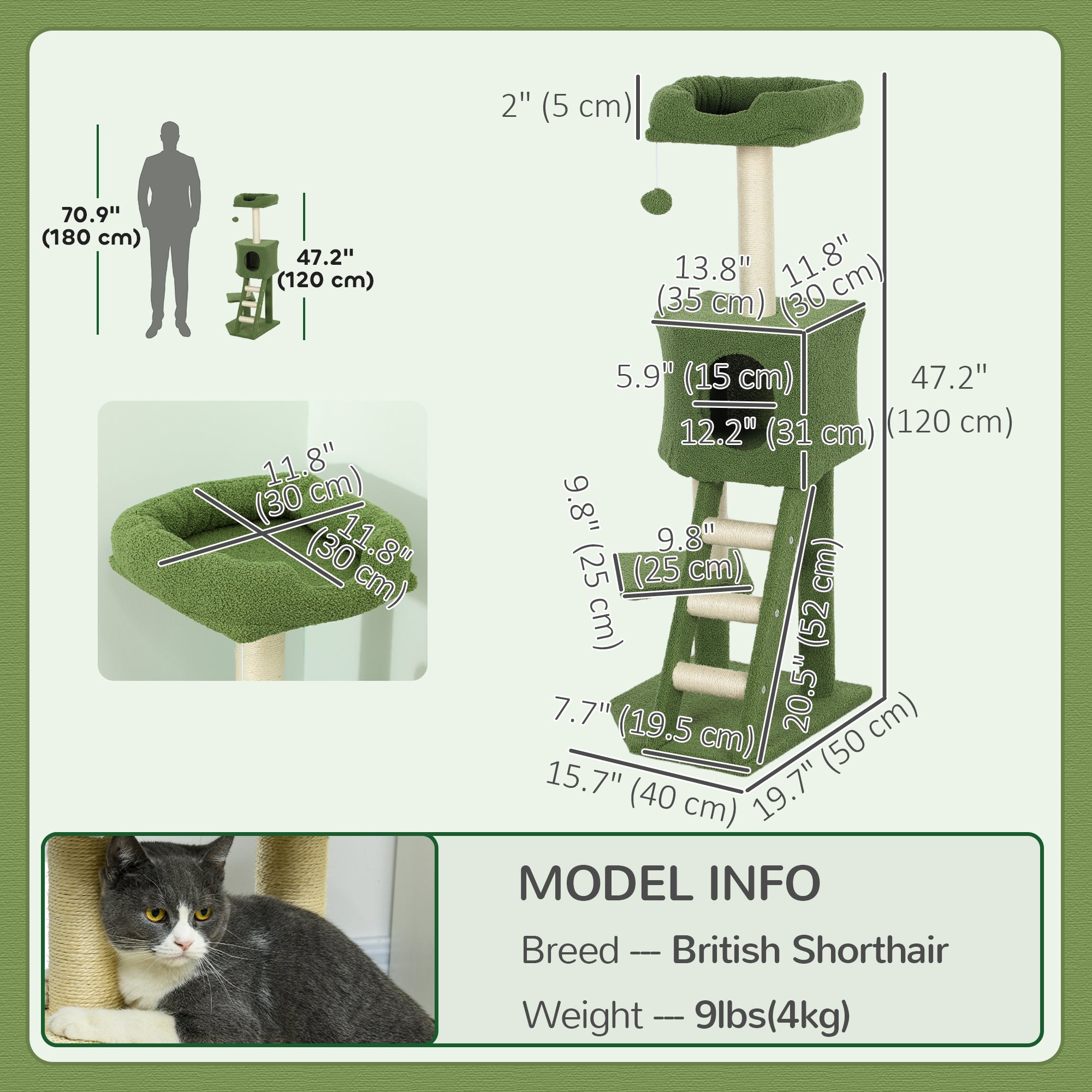 Green and beige cat tree: multi-level tower with scratching posts, condo and perches