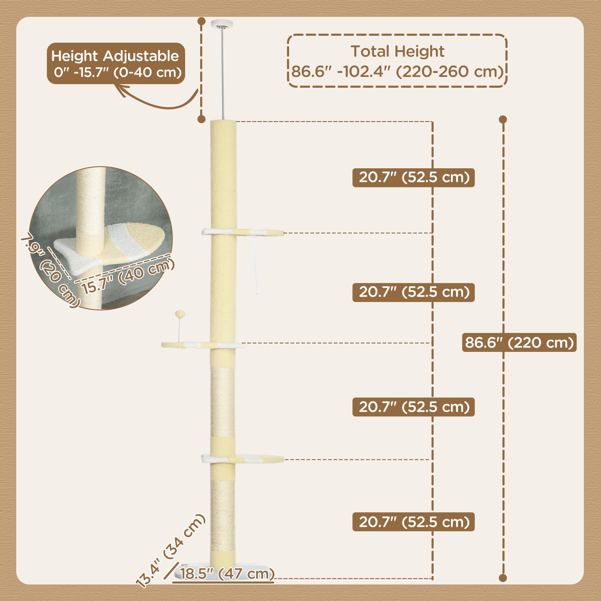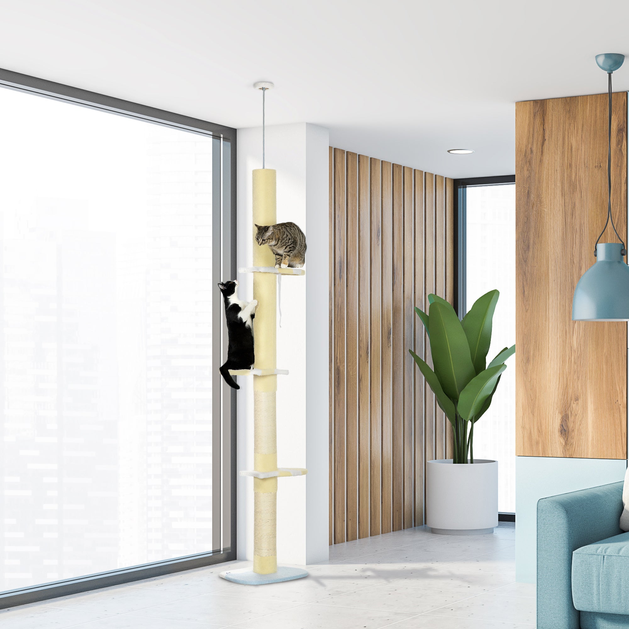 Versatile Use: Designed to extend from floor to ceiling (220 to 260 cm), this cat tree offers multiple soft platforms and natural sisal scratching posts. Ideal for multi-cat households or larger breeds, it allows them to climb, jump, play, and relax in complete safety.