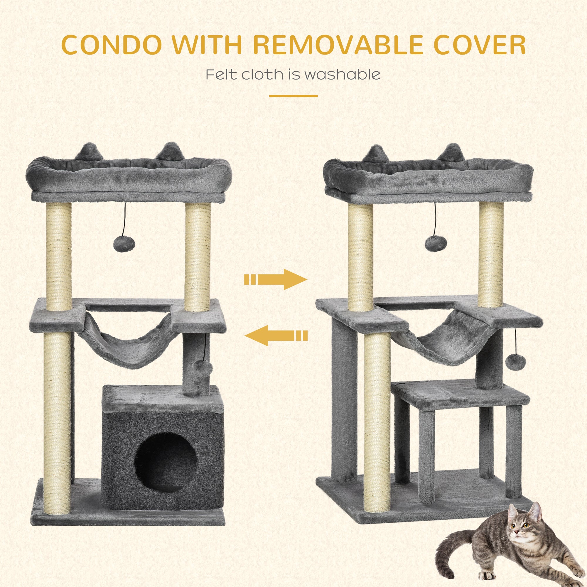 Comfort and safety: The sturdy particleboard structure provides a stable and sturdy base. Covered with soft plush, this cat tree provides a feeling of warmth and security on each level. The cabin is equipped with a removable and washable felt cover, ideal for easy maintenance.