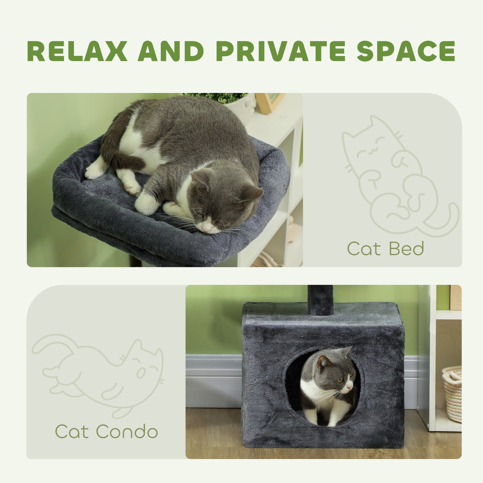 Versatile Use: This complete space includes two cozy beds, an enclosed area, multiple platforms, and scratching posts for your cat to climb, hide, or observe its surroundings. Hanging toys and a teasing rope stimulate its play instincts, while encouraging it to stay active and healthy.